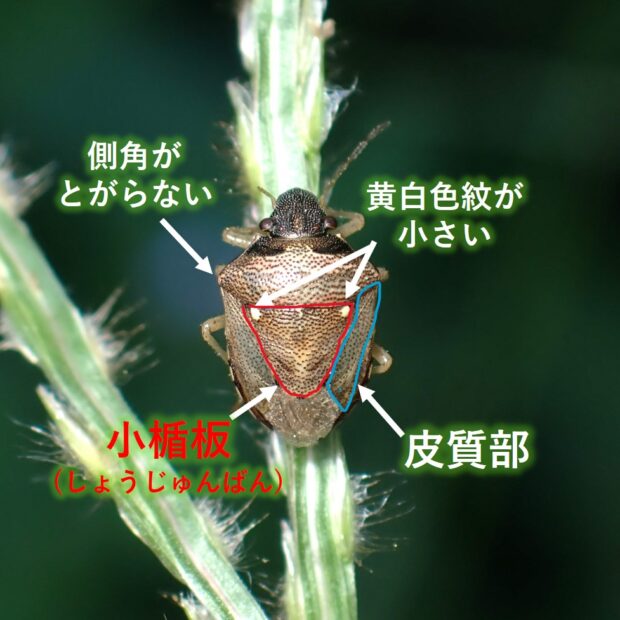イネ科植物につくカメムシ。 シラホシカメムシ類はよく似ており、 識別には注意が必要。 本種は、 体がやや縦長で、 胸の側角が突出しません。 また、 小楯板が短く前ばねの皮質部の先端に届かず、 小楯板の黄白色紋が小さいです。