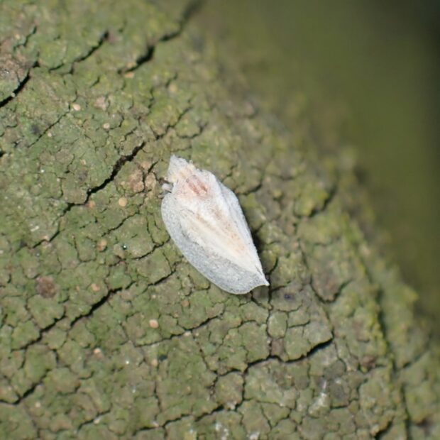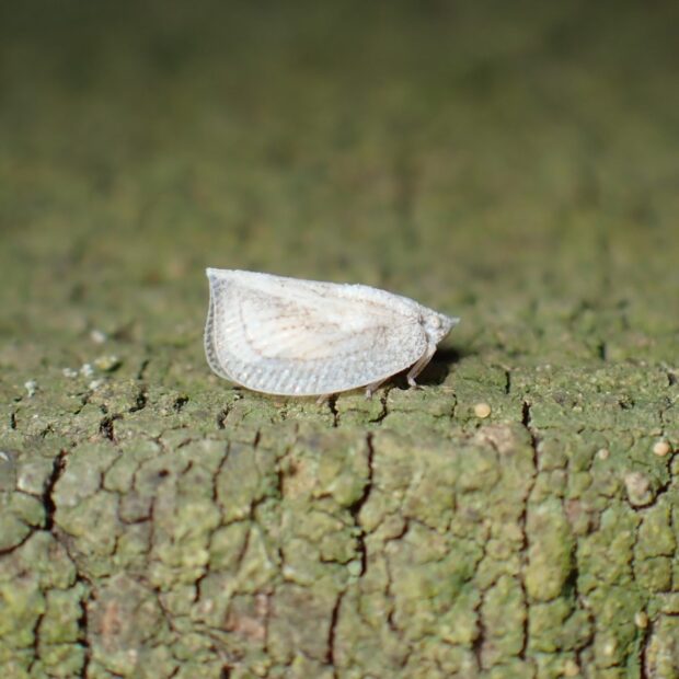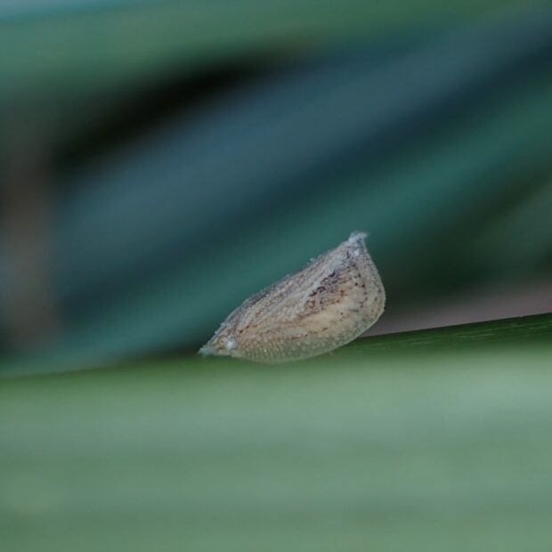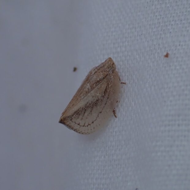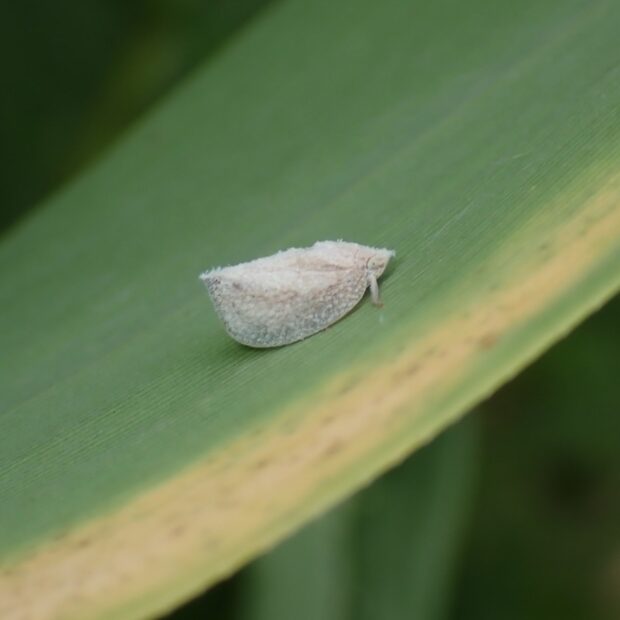 イネ科植物で見られるアオバハゴロモ科の仲間。 体色は淡い褐色で、 頭と前ばねの後端がとがっています。 前ばねには、 顆粒状の小さな突起が多数散らばっています。