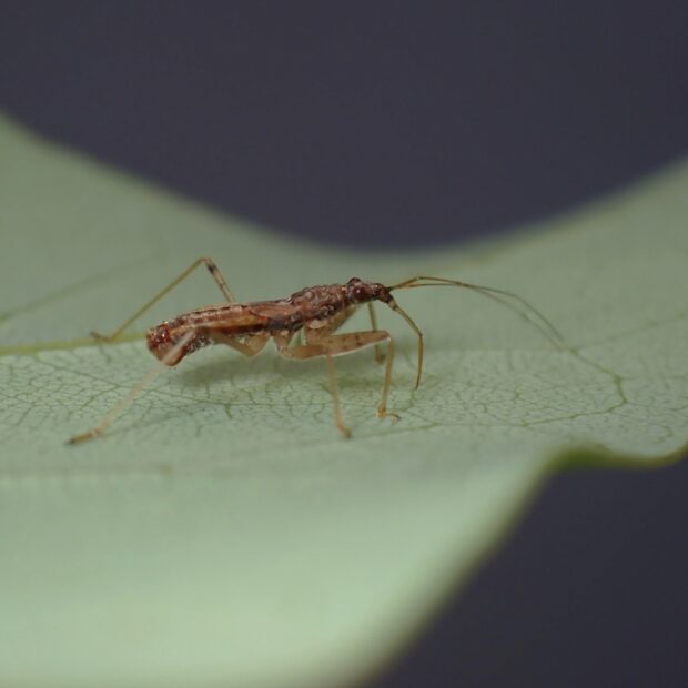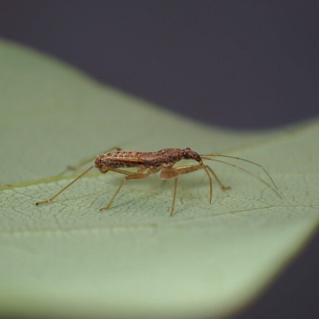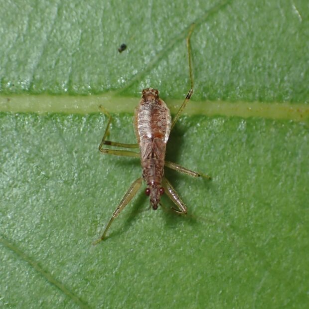 マキバサシガメの仲間。 体は淡褐色で、 はねが短いのが特徴。 はねが短く幼虫のように見えますが、 立派な成虫です。 山の草地や低木などで見られます。