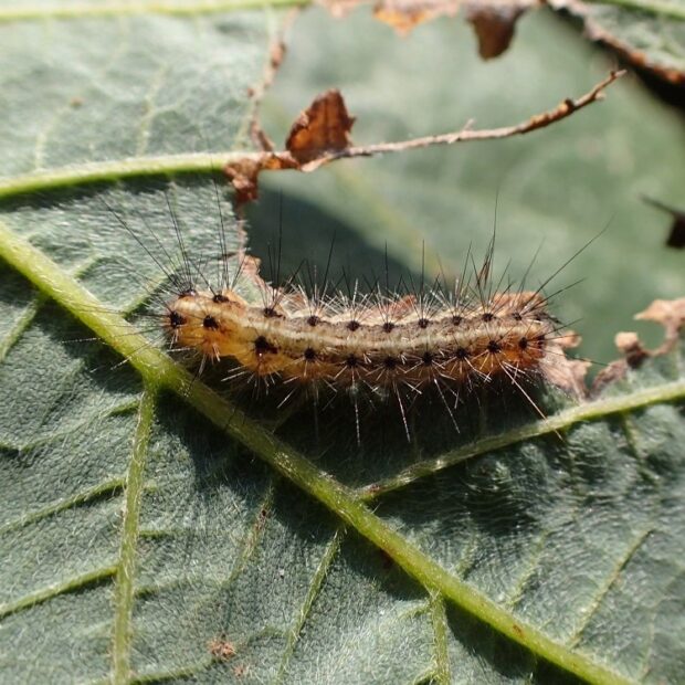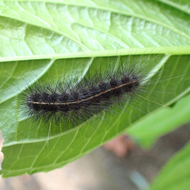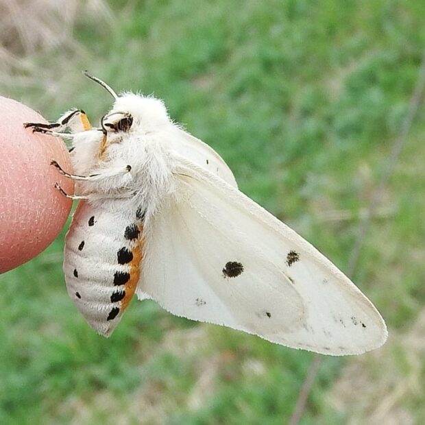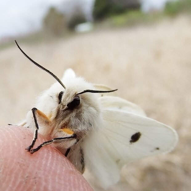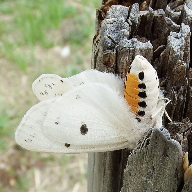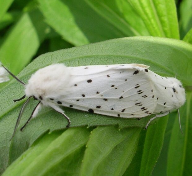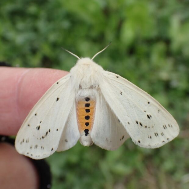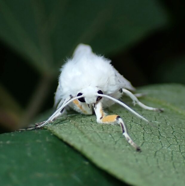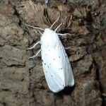お腹が黄色いヒトリガの仲間。 前ばねは白く、 黒い点が散らばっていますが、 この黒点には変異があり違いがみられます。 ゴマをまぶしたような模様から「ゴマダラ」と名づけられました。 明かりにやって来ます。