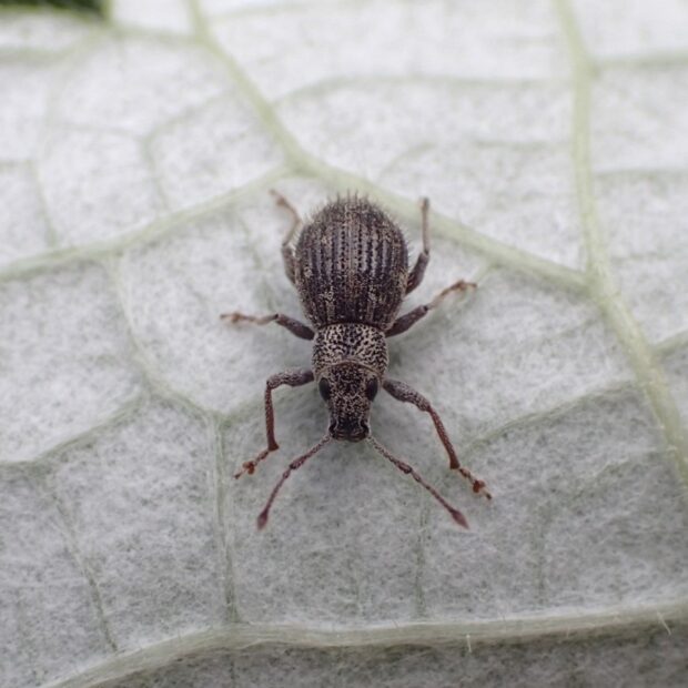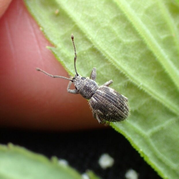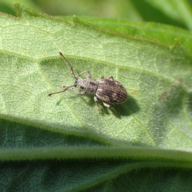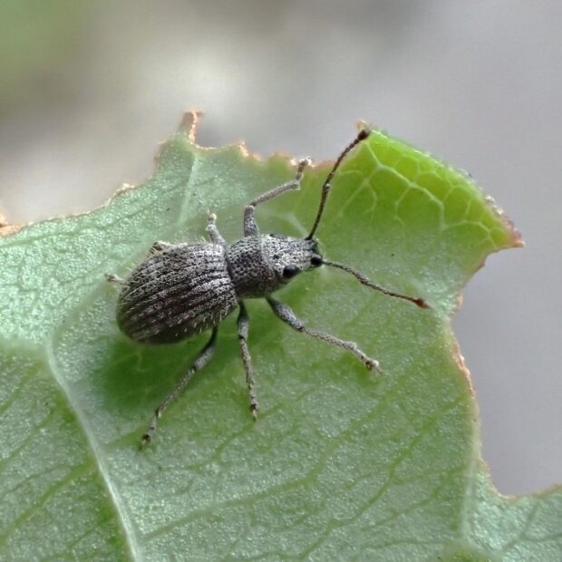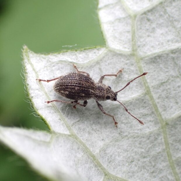 クチブトゾウムシの仲間。 体は灰色で、 上翅は長い毛におおわれ、 触角は長めです。 マメ科植物のほか、 いろいろな葉で見られます。 単為生殖を行うことが知られています。