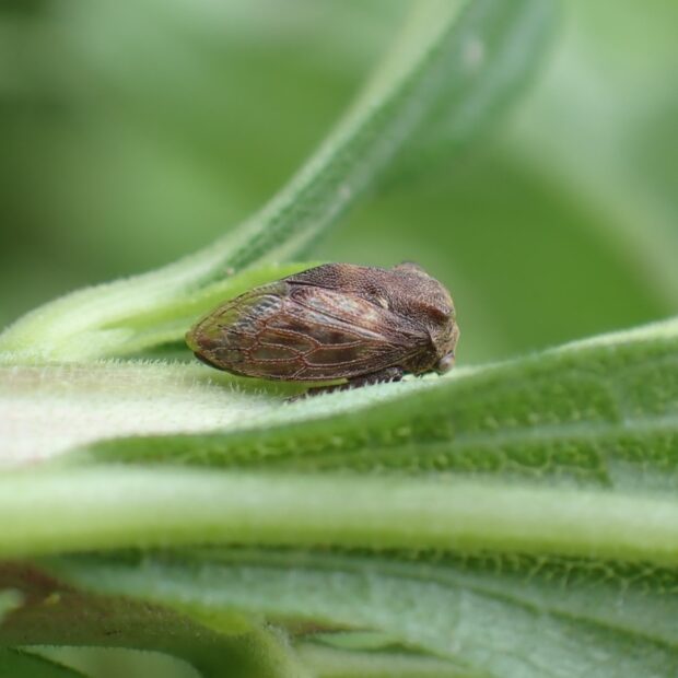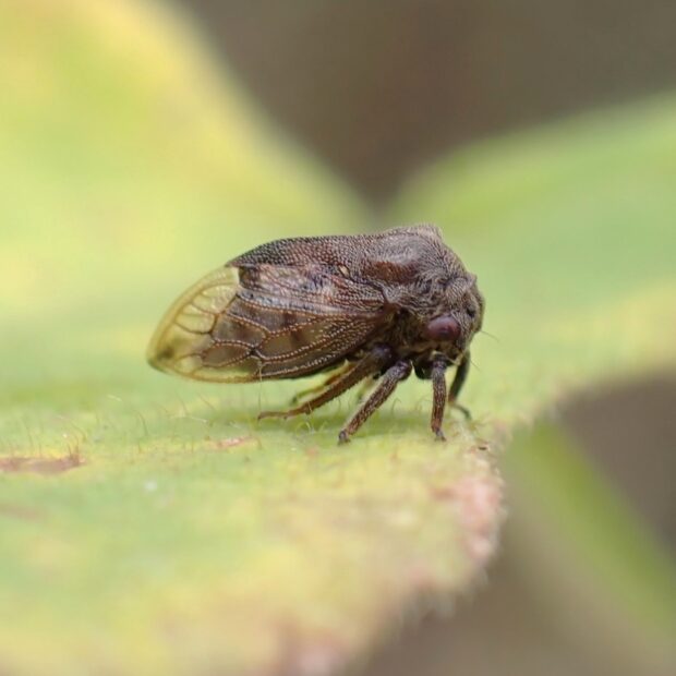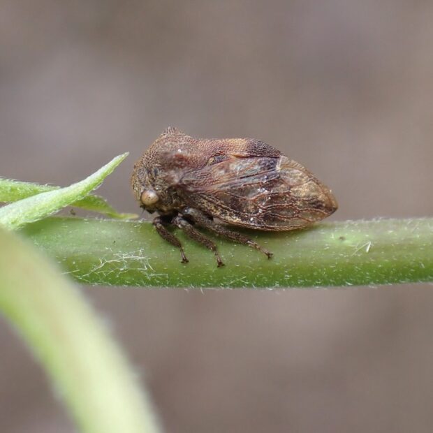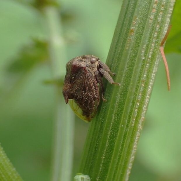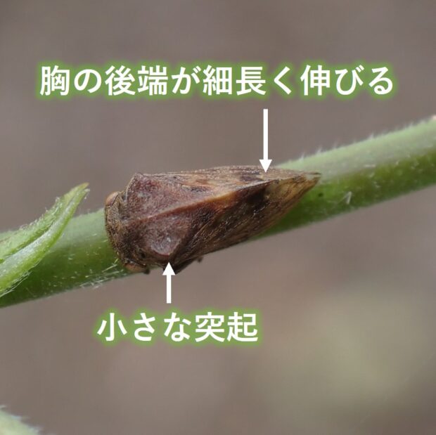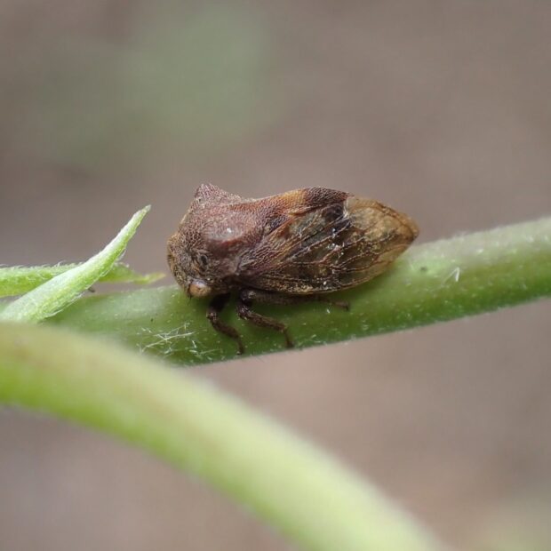 ツノゼミの仲間。 ツノゼミの仲間では、 最も普通に見られます。 体は丸っこく茶色で、 胸の左右に小さな突起があります。 林縁などで、 フジやハギなどの他、 いろいろな植物の茎にとまり汁を吸います。