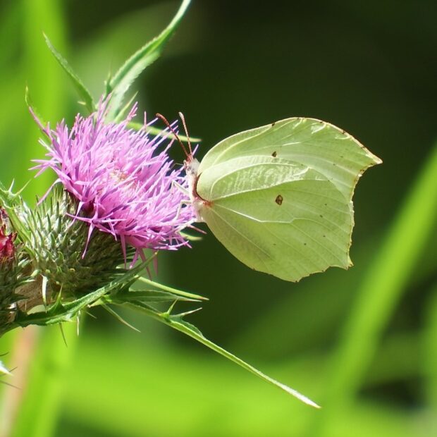 シロチョウ科の仲間。 丘陵地~山地の林縁などで見られます。 オスの前ばねの表面は黄色で、 メスはクリーム色。 6~7月に発生し、 しばらく活動した後夏眠します。 秋に再び活動後、 成虫で冬を越す長生きのチョウです。