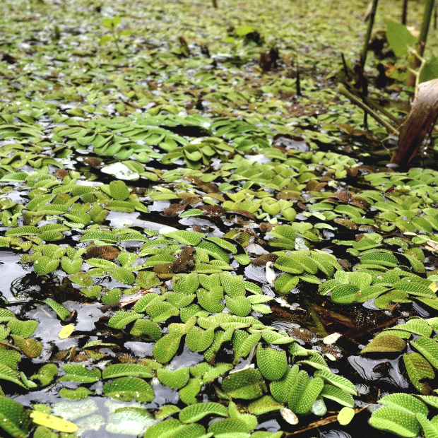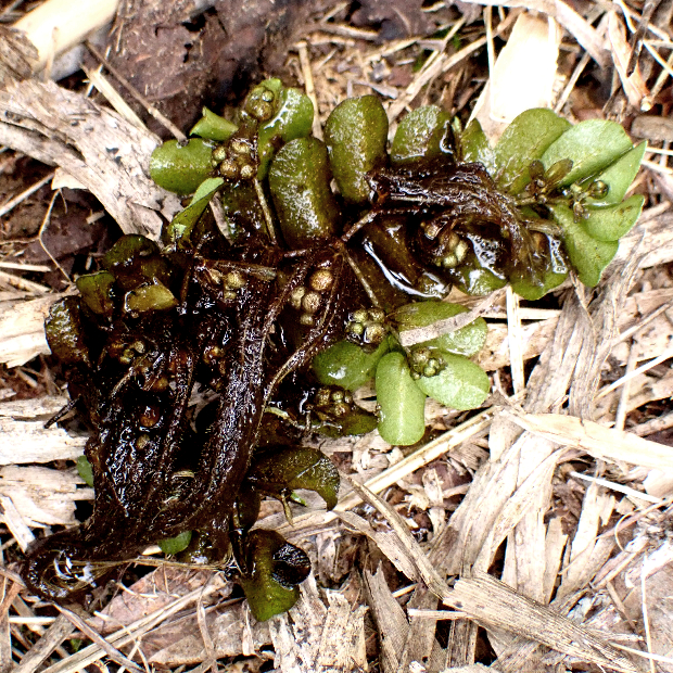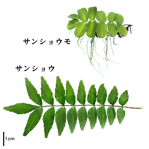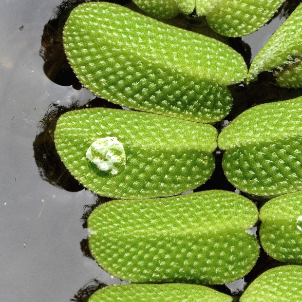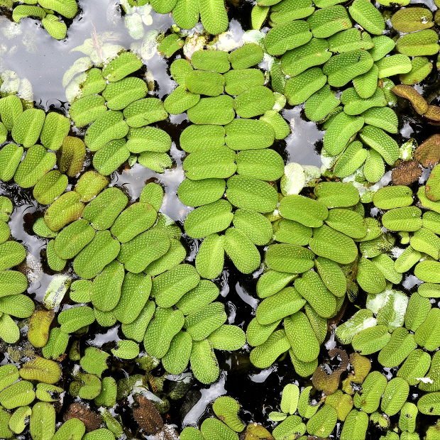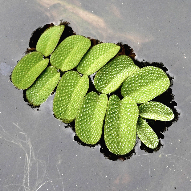 水面に浮かんで生活する水生シダ。 サンショウの葉っぱに例えられた姿をしていて、 表面の毛で水をよくはじきます。 水中に伸びている茶色い根っぽいのは葉が変化したもので、 根をもちません。 シダなので花は咲かず、 秋になると水中に丸い胞子のう果を多くつけます。