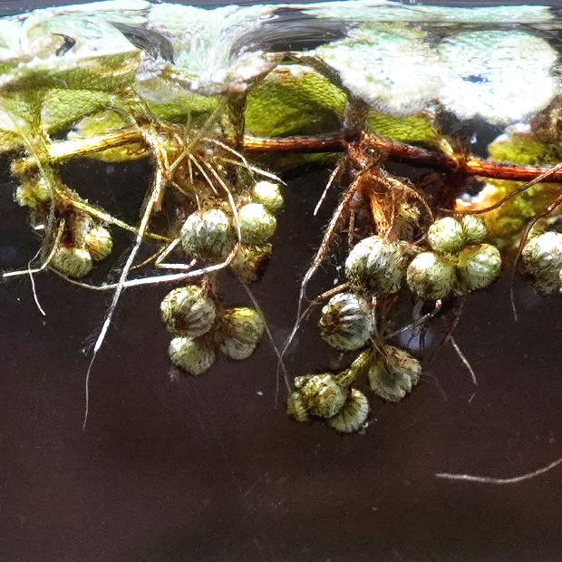 緑色の水上葉がよく目立ちますが、 もう1つ水中葉もつけます。 下に多く出ている根っぽいものがまさにこれ。 サンショウモの根は退化してなく、 葉がその役割をしているのです。 また、 植物体が転覆しないようにする重りの機能もあります。