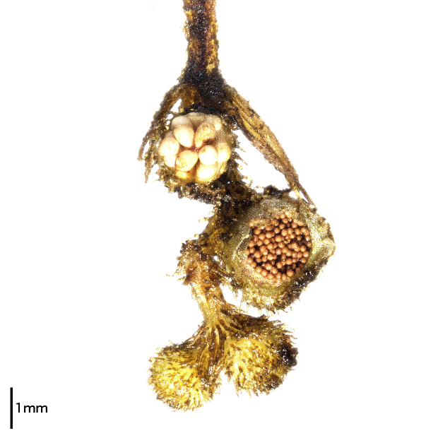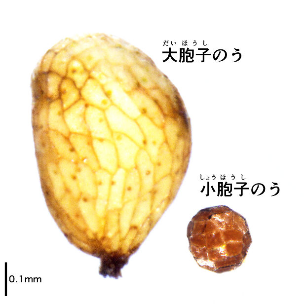 水中葉に丸い胞子のう果をいくつかつけますが、 基部に近いものは大胞子、 それ以外はふつう小胞子をつくります。 これを異形胞子性といい、 大胞子は雌、 小胞子は雄の役割を果たします。 同じ特徴をもつシダ植物はほかにイワヒバなどのイワヒバ科、 ミズニラ、 アカウキクサ、 デンジソウなどがあります。