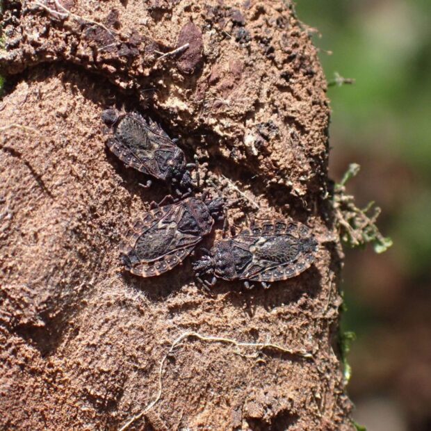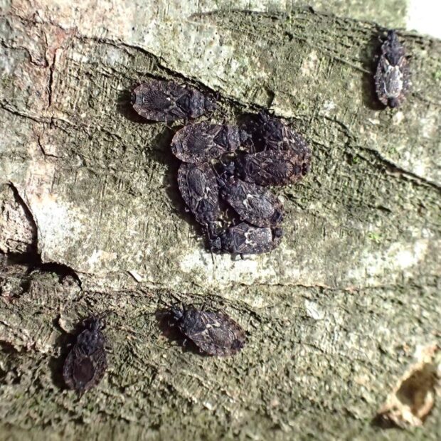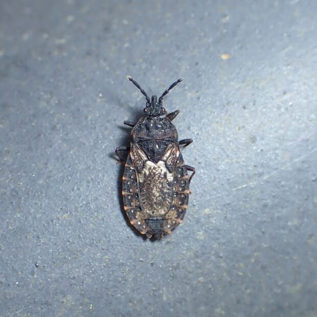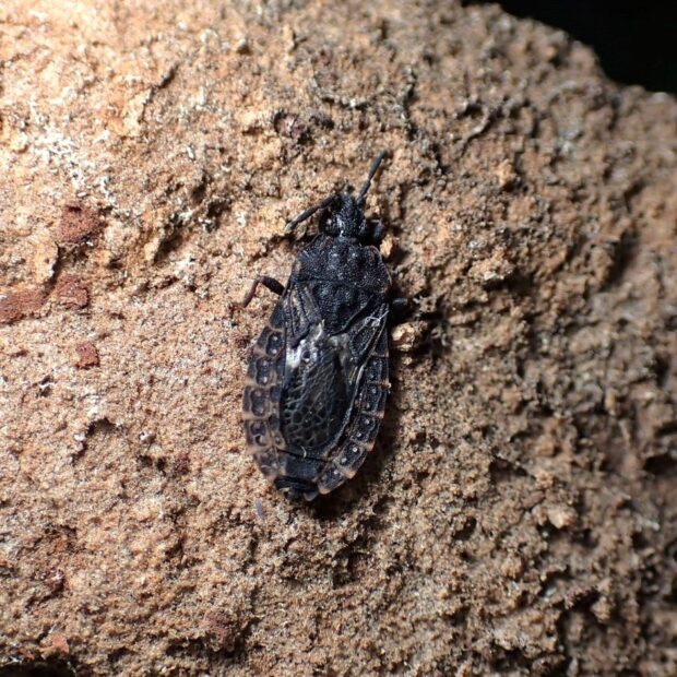 ヒラタカメムシ科の仲間。 名前の通り、 非常にへん平な体型が特徴。 体色は黒褐色で、 卵型をしています。 平地~山、 倒木や樹皮の下で普通に見られ、 キノコなどを食べます。