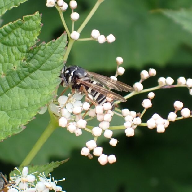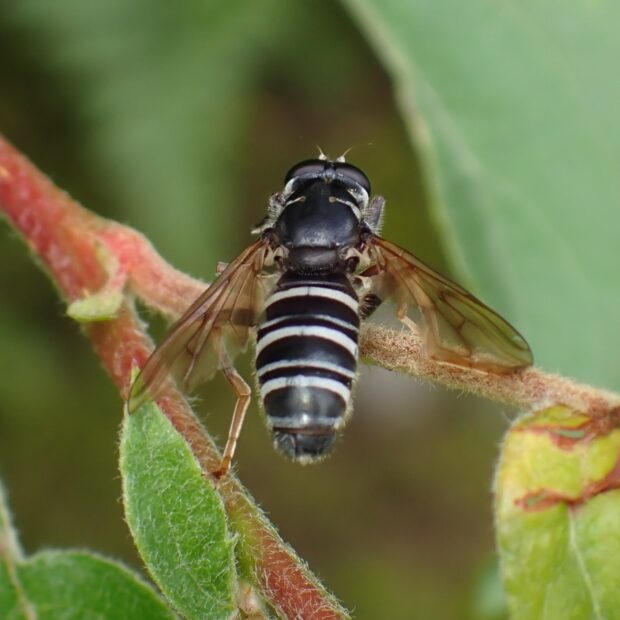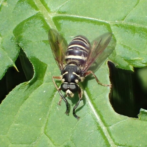 山地に生息するハナアブの仲間。 クロスズメバチに似せているのか、 葉にとまっているときは、 前あしを伸ばして触角のように見せます。 夏、 山の花で見ることができます。