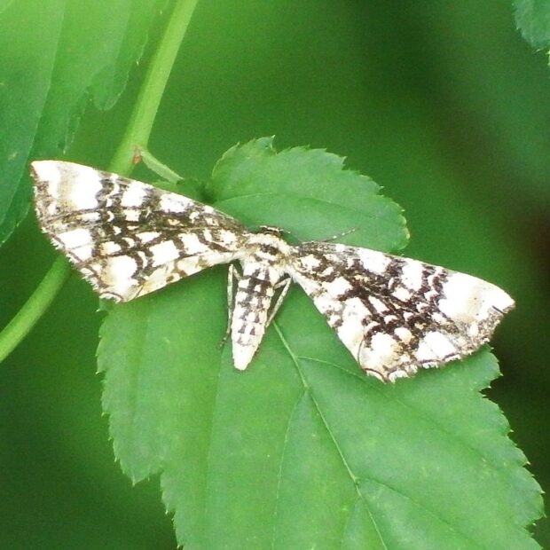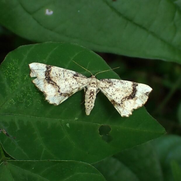 山地性のエダシャク。 はねの色や模様はさまざまで、 非常に変化に富みます。 はねの縁は波型で、 前ばねの先端はとがります。 後ばねを隠す独特な姿で葉にとまります。