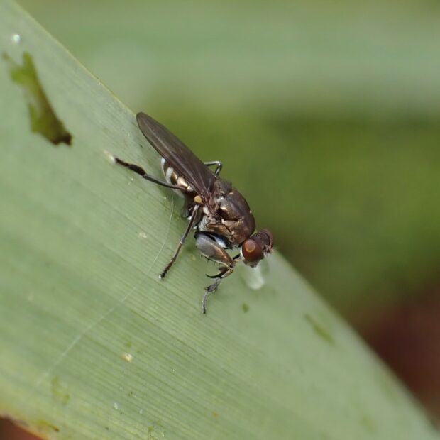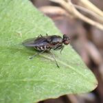 ミギワバエの仲間。 個体数は多く、 湿地や水際で普通に見られます。 前あしが、 カマキリのように鎌状になっておりトゲがあります。 ジャンプして獲物に飛びかかり、 前あしで獲物を取り押さえます。 鎌状の前あしを大きく広げて、 威嚇し合う姿をよく見かけます。