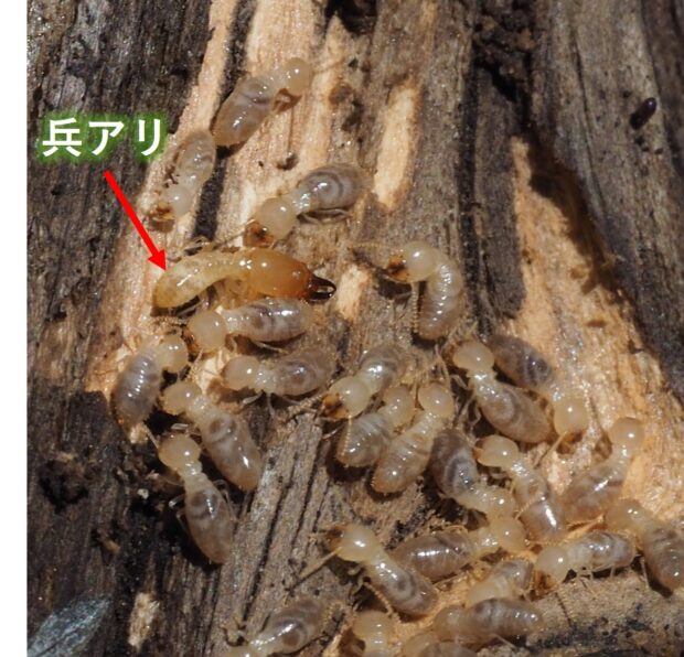 シロアリはゴキブリに近い仲間です。 ヤマトシロアリは朽ち木、 石の下、 人家など、 暗くて湿った場所に巣を作ります。 シロアリは女王、 王、 ワーカー(働きアリ)、 ソルジャー(兵アリ)、 ニンフ(羽アリになる)がそれぞれ役割分担をしている家族集団です。