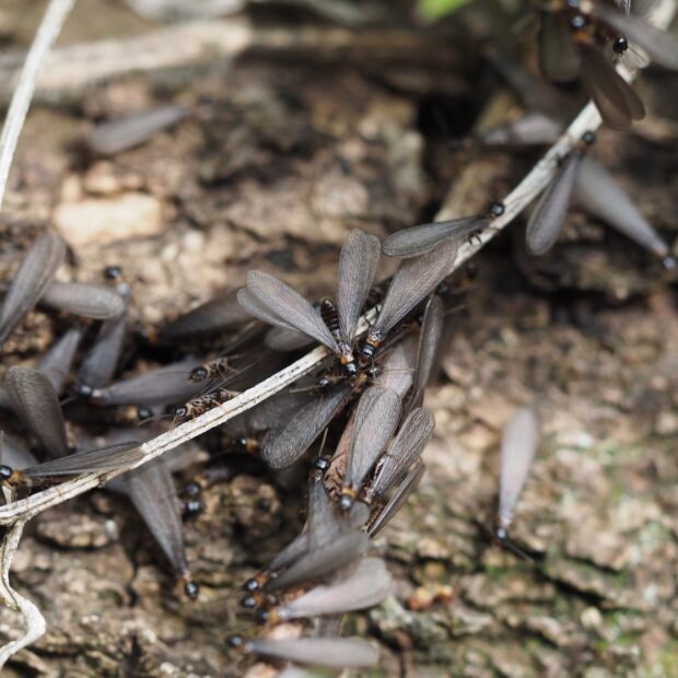 4~5月、 雨の翌日、 快晴の日の午前中、 巣から多数の羽アリ(オスとメス)が出てきます。 出会ったオスとメスははねを落とし、 新しい巣をつくり、 創設王と創設女王になります。 シロアリの創設王はとても長生きです(数十年)。