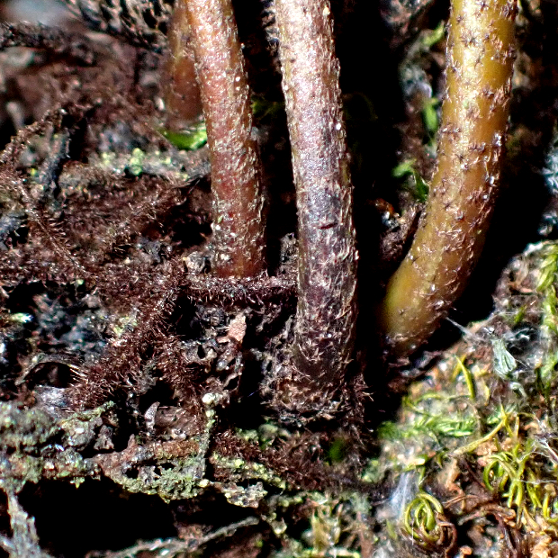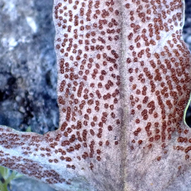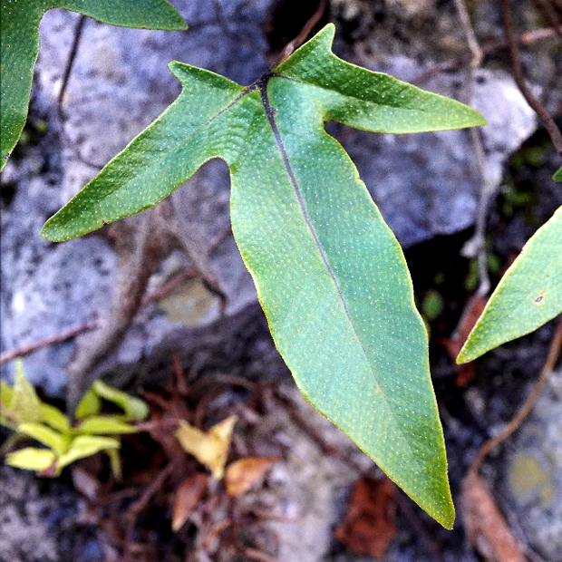 岩場などに生える着生シダ。 葉は厚くて、 下部が3から5つに浅く切れ込み、 葉裏に星型の毛や胞子のう群をびっしりつけます。 水生植物のオモダカの葉に似た形をしていて、 これが名前の由来になりました。