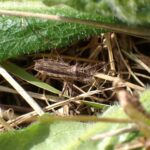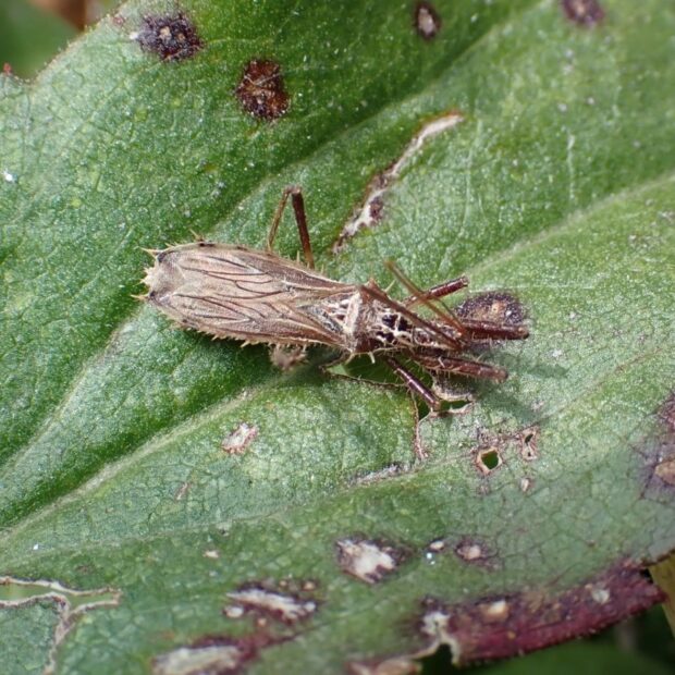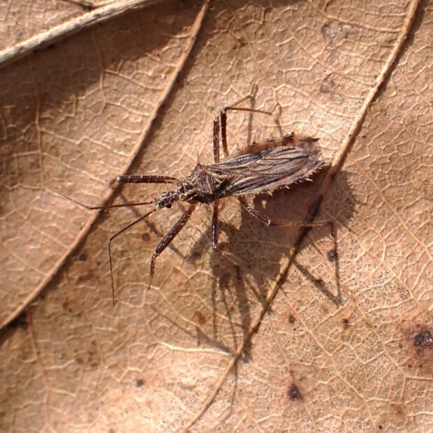 草地の地表で見られるサシガメ。 体は淡い褐色で、 名前の通り、 大小のトゲでおおわれています。