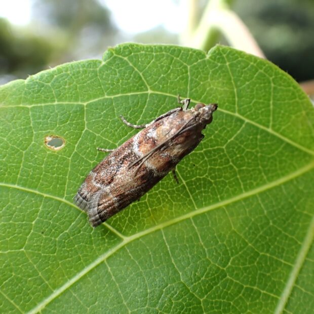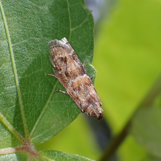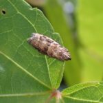 メイガ科の仲間。 海岸のクロマツ林などで見られる小さなガ。 幼虫は、 松ぼっくりや新しく伸びた枝を食べます。 成虫は初夏にあらわれます。