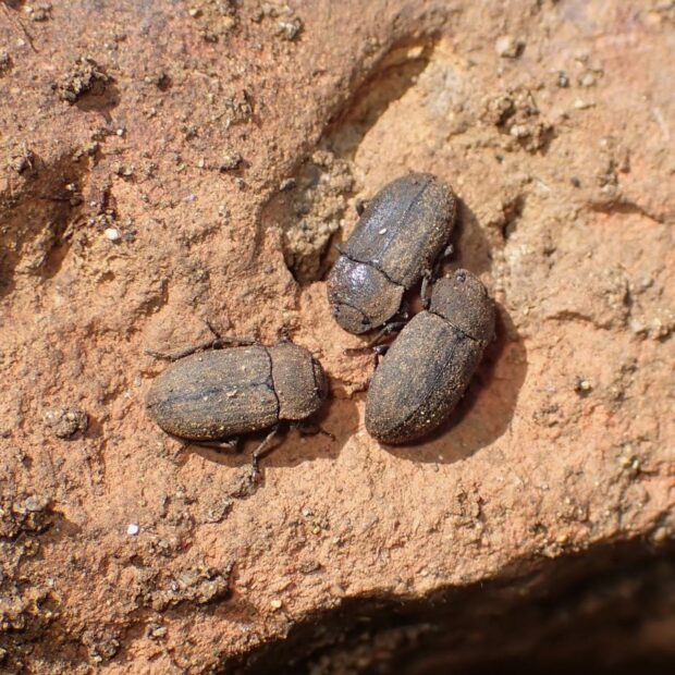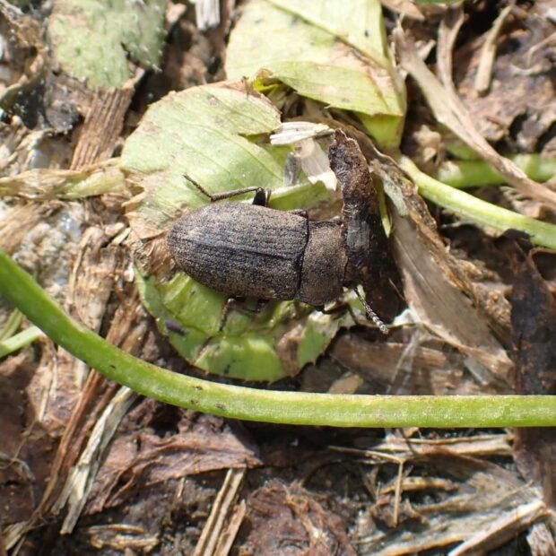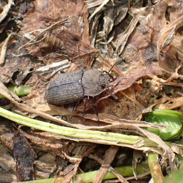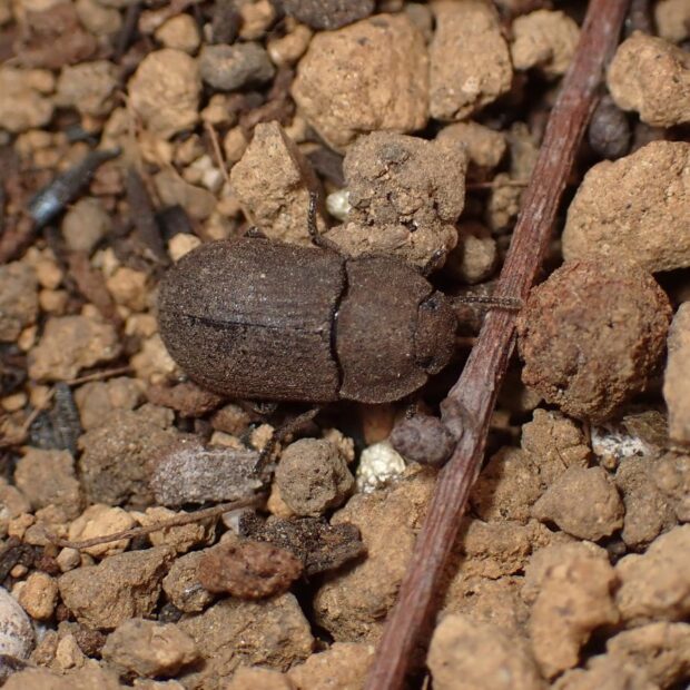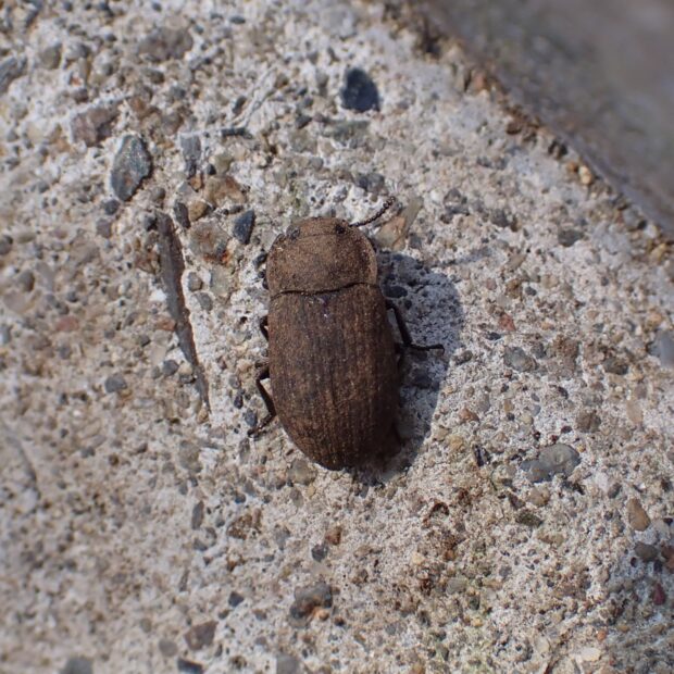 ゴミムシダマシ科スナゴミムシダマシの一種。 黒褐色~黒色で艶消し状。 草はら、 畑など、 乾燥気味の所で普通に見られます。 似ている種類が多いので識別には注意が必要。