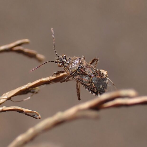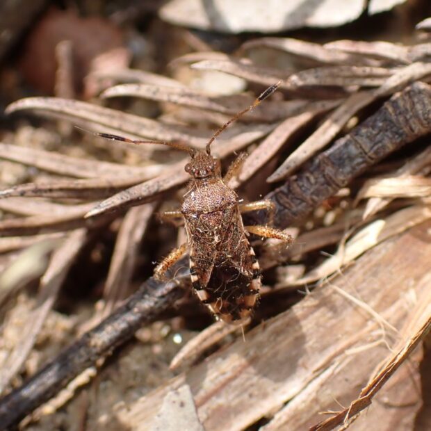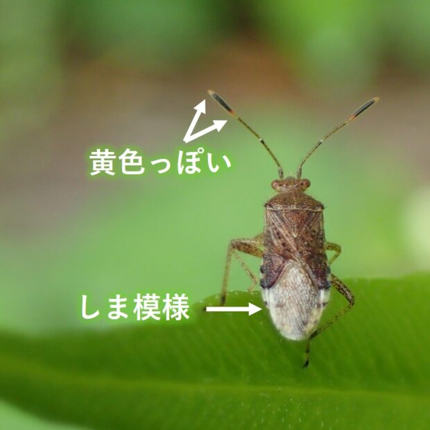 草はらで見られるヒメヘリカメムシの仲間。 体は褐色で、 名前のとおり、 細かな毛におおわれています。 ヒメヘリカメムシの仲間は似ているので識別には注意が必要。