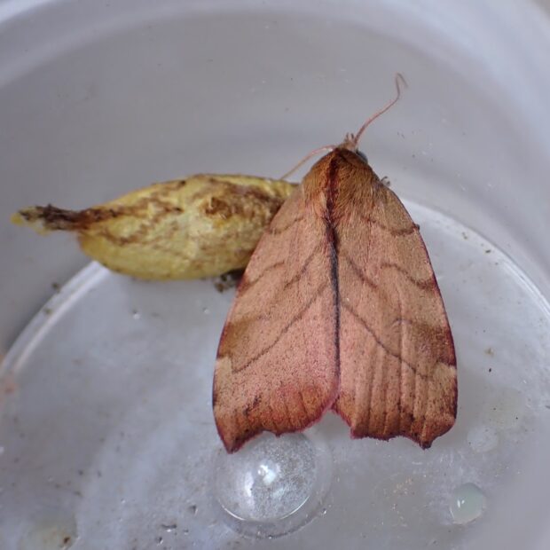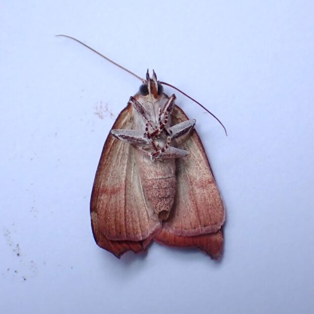 コブガ科リンガの仲間。 茶褐色の前ばねに、 段違いにずれた横線があります。 はねの色は、 赤っぽいものから茶色っぽいものまでいろいろ見られます。