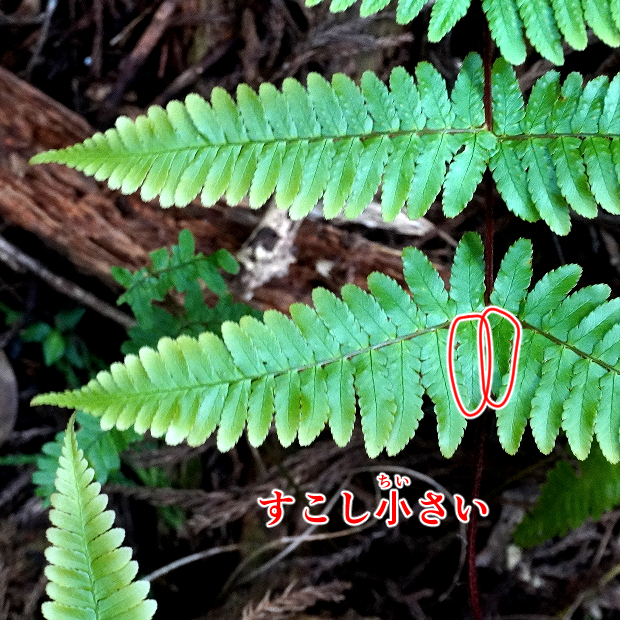 最下羽片の葉軸に接する下向き小羽片が、 となりの小羽片よりすこし小さい。