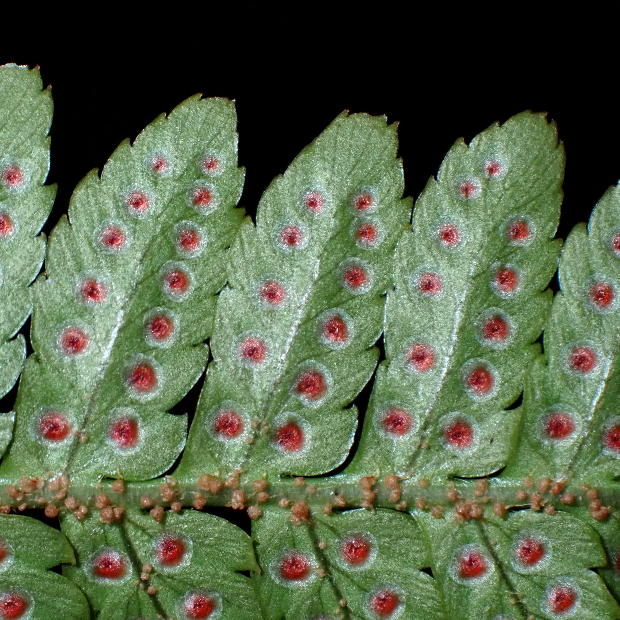 胞子のう群は円形で、 フチと脈の中間につくことが多いが、 フチ寄りや脈寄りのこともある。