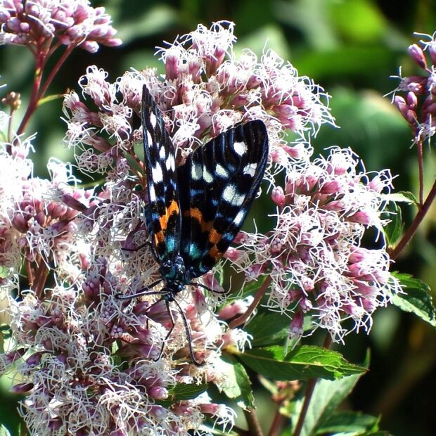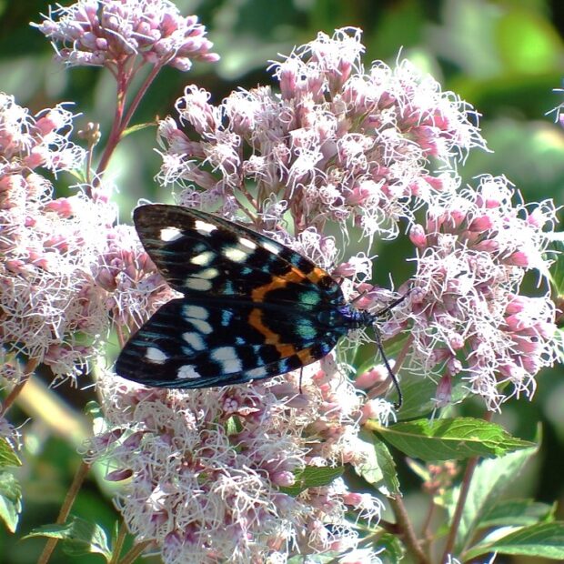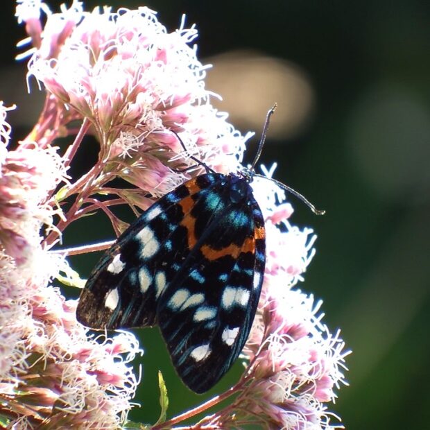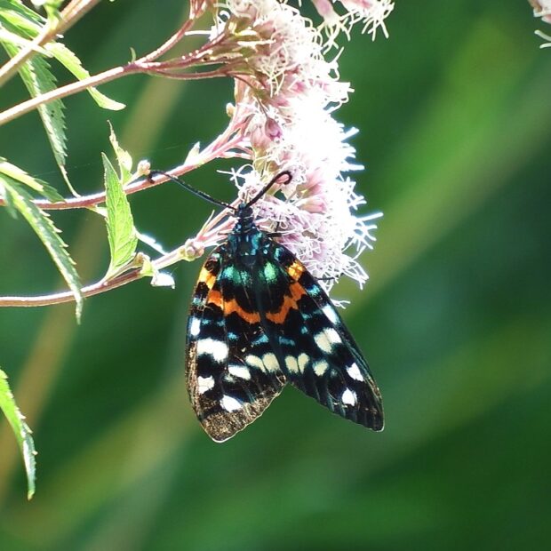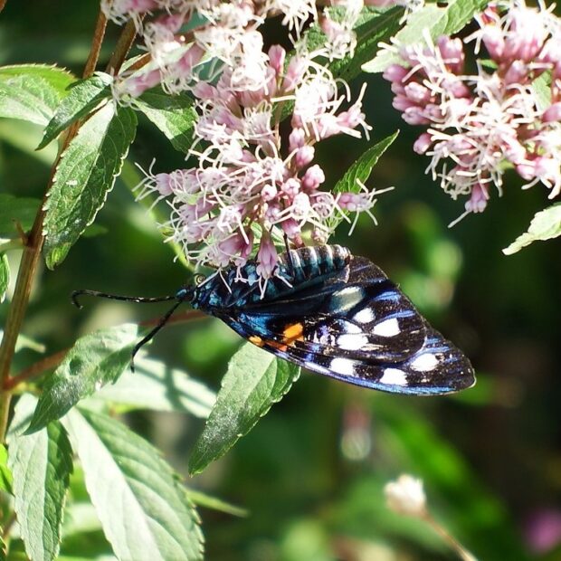 マダラガの仲間。 るり色のはねに、 赤い帯と白い紋がある美しいガ。 昼間に飛び、 花にやって来ます。 つかむと、 身を守るために黄色い泡を出します。