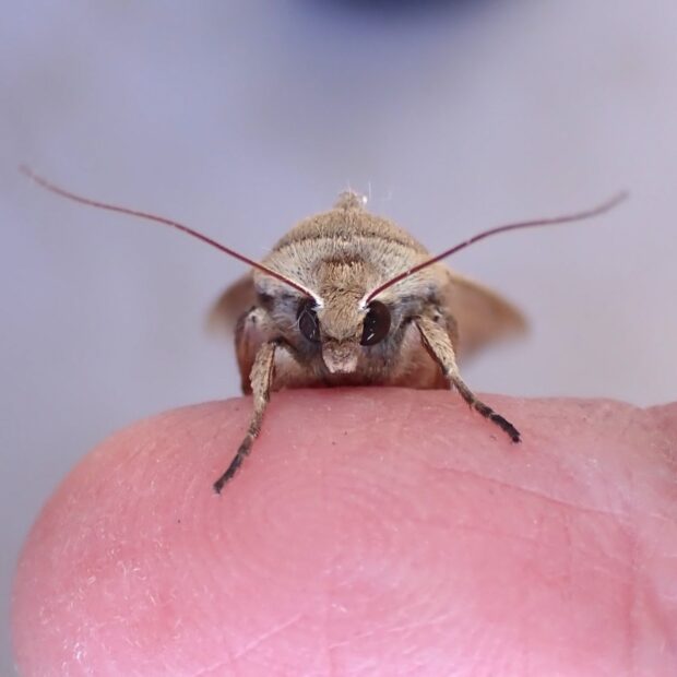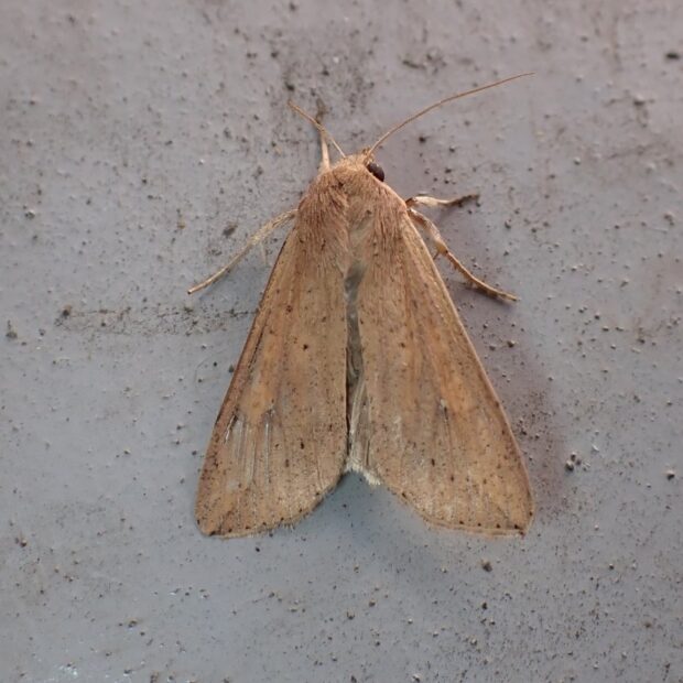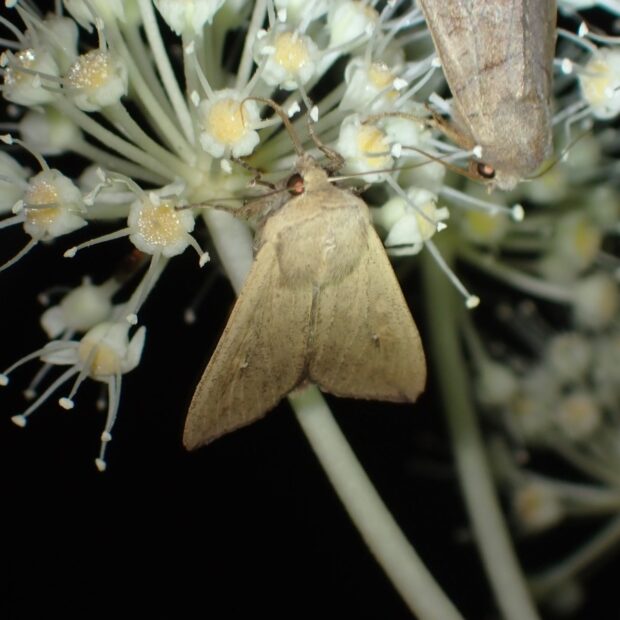 ヤガ科ヨトウガの仲間。 イネ科植物を食べる灰褐色のガ。 中国から日本に飛来した成虫の産卵によって大発生が起きることがあります。 幼虫の密度により、 体色や行動が変化することが知られています。