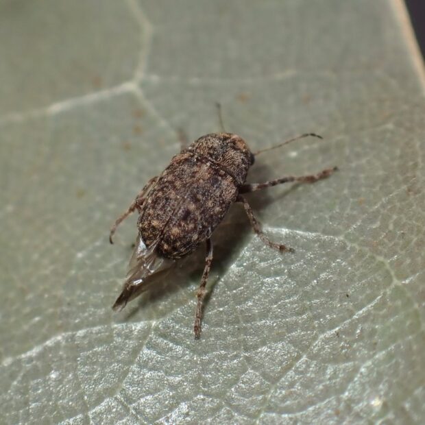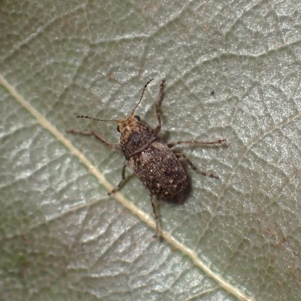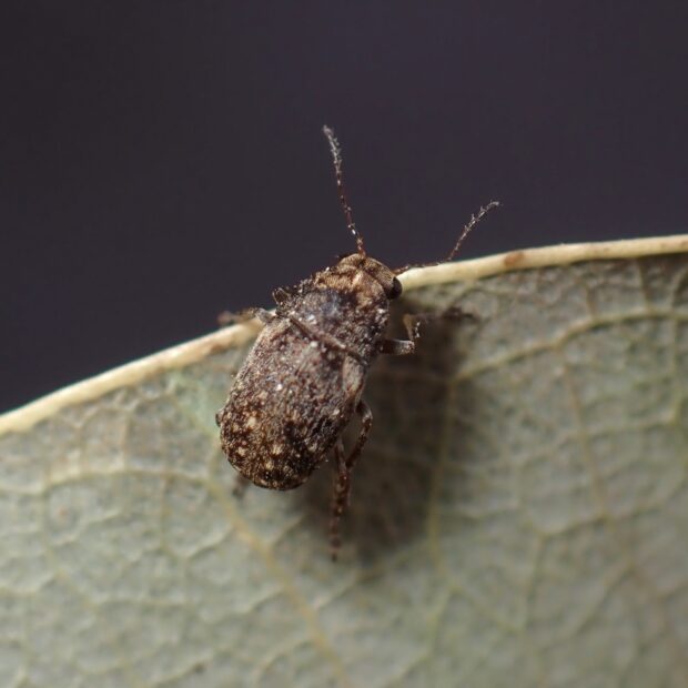 とても小さなヒゲナガゾウムシ科の仲間。 ヒゲナガゾウムシは口吻(こうふん)が短く、 ゾウムシらしくありません。 伐採木などで見られます。 コーヒー豆、 綿の実、 ミカンなどにつくワタミヒゲナガゾウムシに似ています。