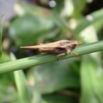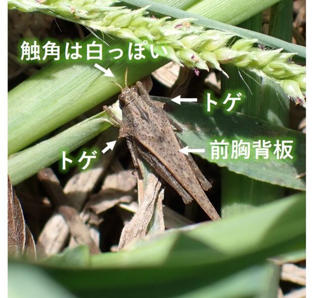 田んぼの周辺など湿ったの地面で見られるヒシバッタ。 体は褐色で、 はねが長く、 胸の両側にあるトゲが特徴。 近づくと、 水に飛び込み泳いで逃げることがあります。 同じ環境にいるハネナガヒシバッタに似ていますが、 本種は大きいです。