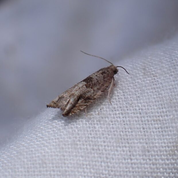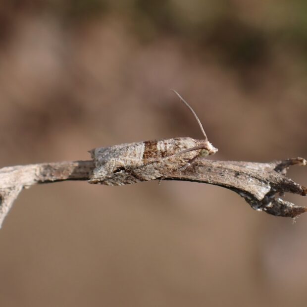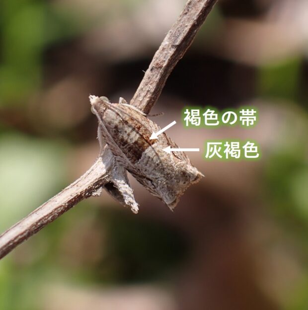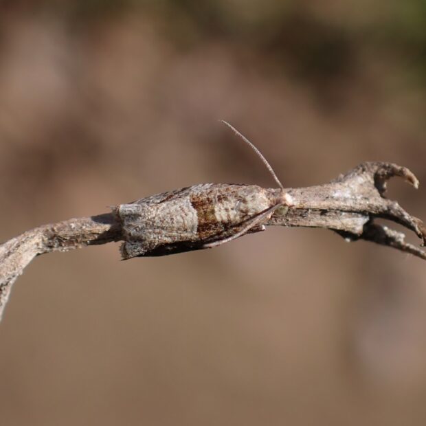 ハマキガ科ヒメハマキの仲間。 前ばねの真ん中あたりに褐色の太い帯がある小さなガ。 普通に見られ、 明かりにやって来ます。