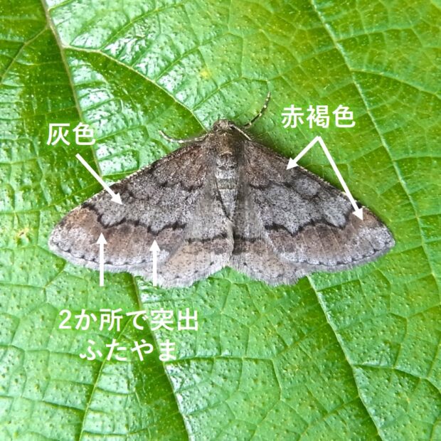 シャクガ科エダシャクの仲間。 外横線が二つの山のようになっていることが、 「フタヤマ」の名前の由来です。 触角はオスはくし歯状、 メスは糸状です。 明かりにやって来ます。