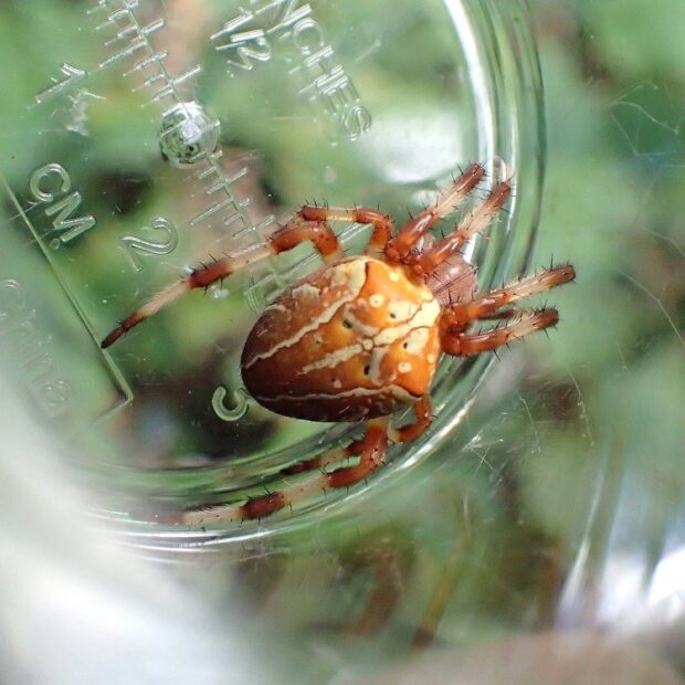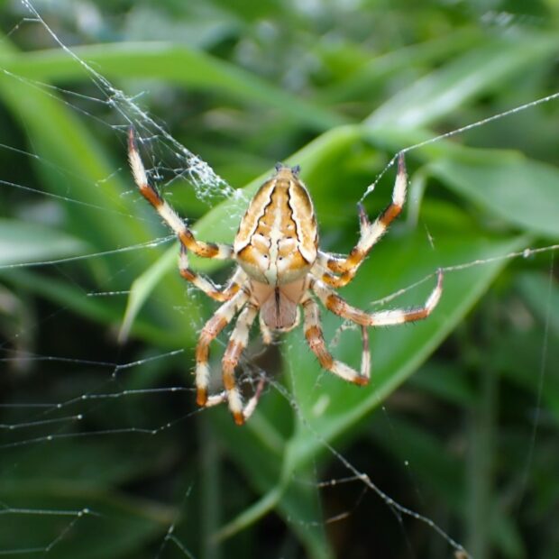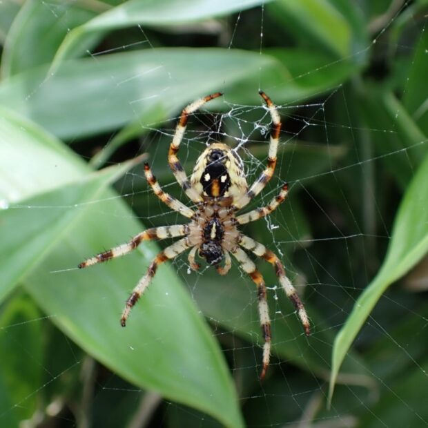 コガネグモの仲間。 山地の林道、 渓流沿いの草の間、 低木の間などで見られ、 低い場所に大きな正常円網を張ります。 網の端に葉を折り曲げて住居を作り、 昼間はその中に隠れています。 腹部の色はオレンジ色、 黄色、 黄緑色などさまざまです。 北海道では平地でも見られます。