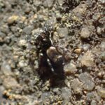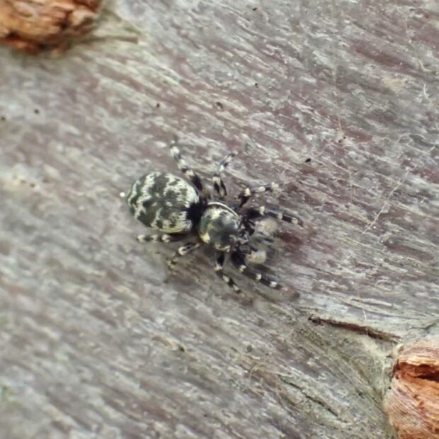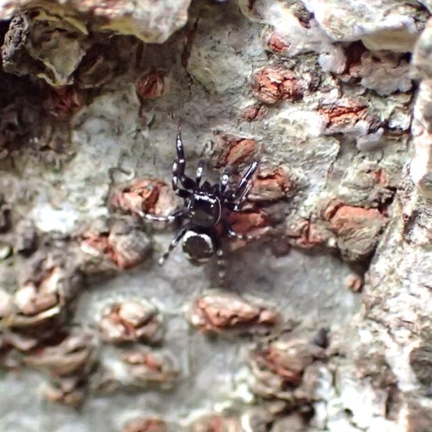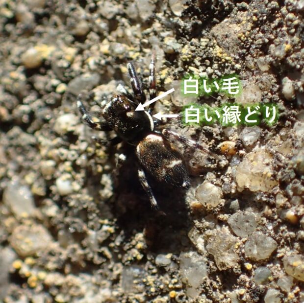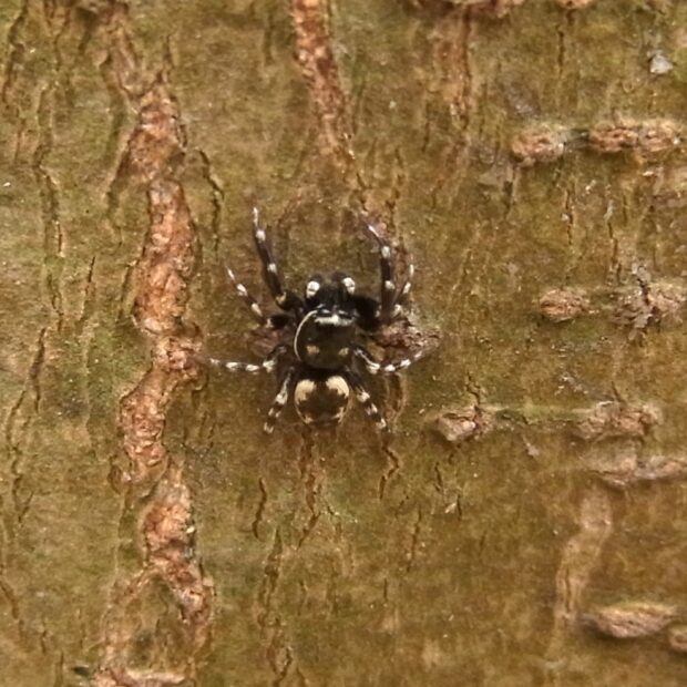 ハエトリグモの仲間。 草地や木の幹などで見られ、 冬は樹皮の下で越冬します。 オスは黒っぽく、 メスは白い紋が多く、 ギザギザのしま模様があります。 この稲妻のような模様から、 「イナズマ」と名づけられたようです。