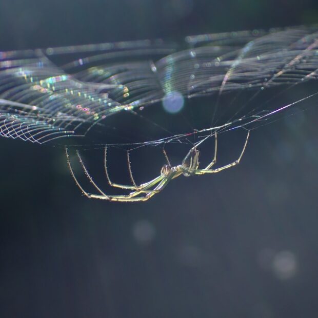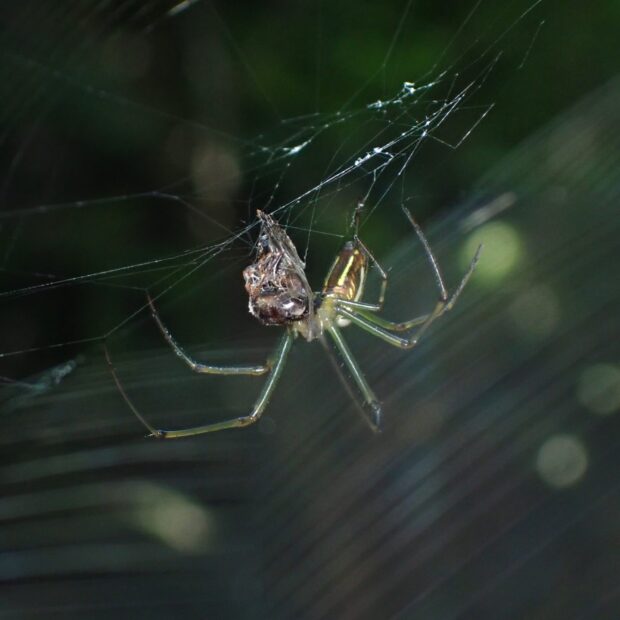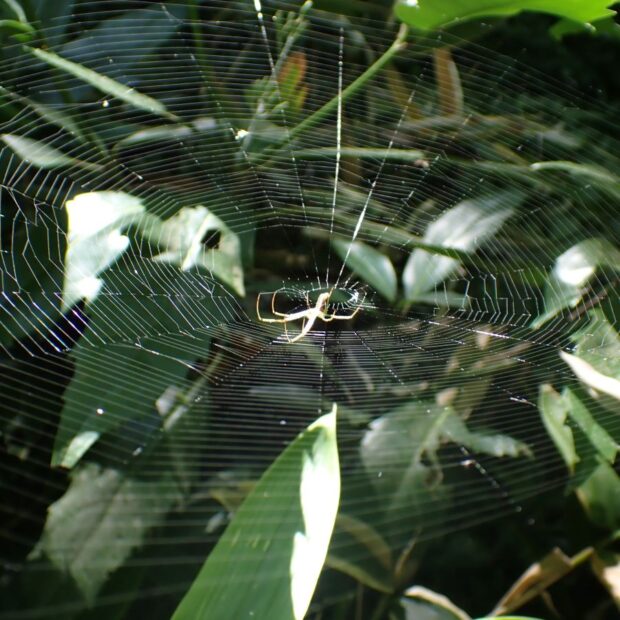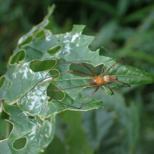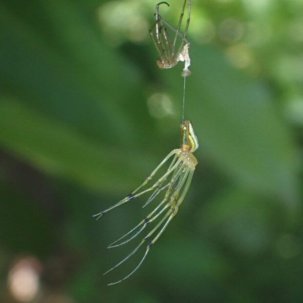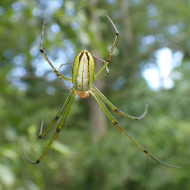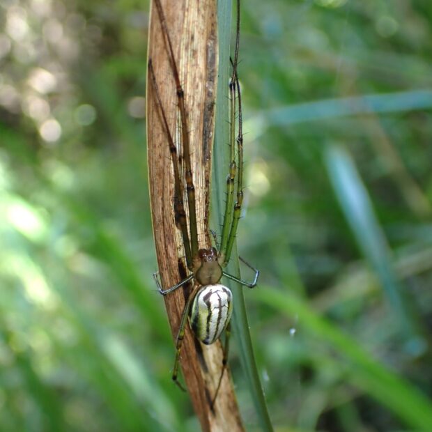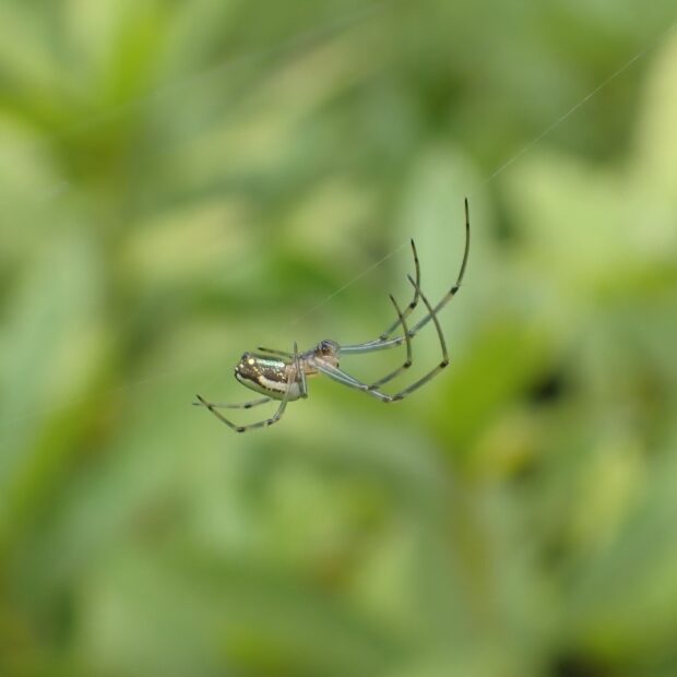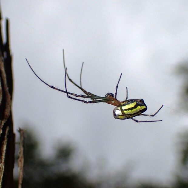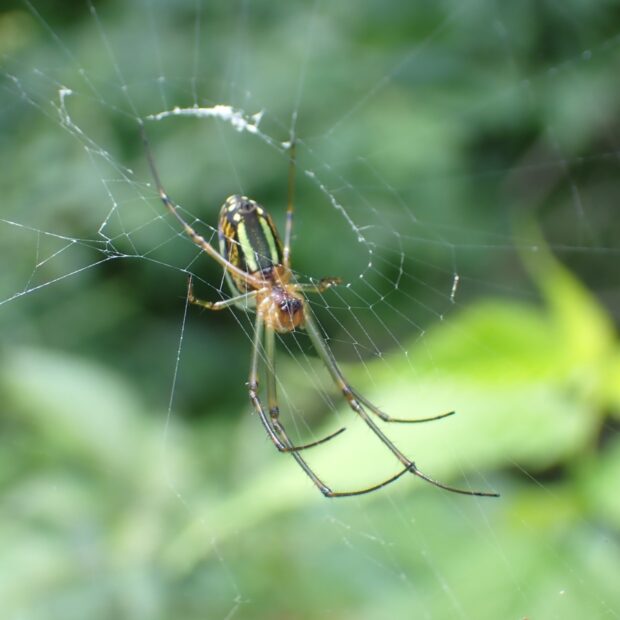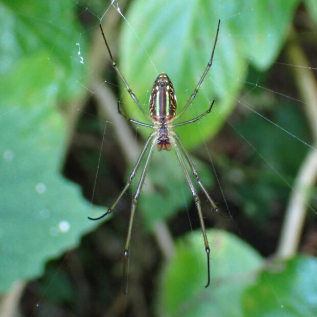 アシナガグモの仲間。 腹部には3本の縦線があり、 刺激を与えると太くなります。 山地から平地にかけて広く生息し、 水辺や草の間に大きな水平円網を張ります。 コシロカネグモに似ていますが、 本種の方が大きいです。