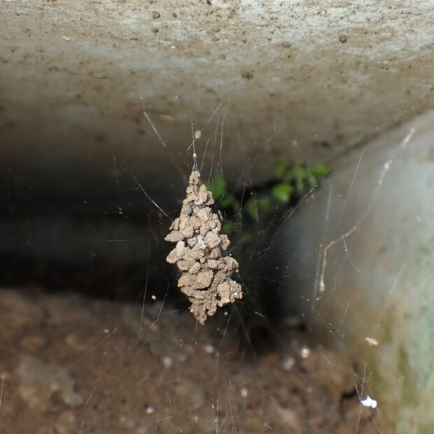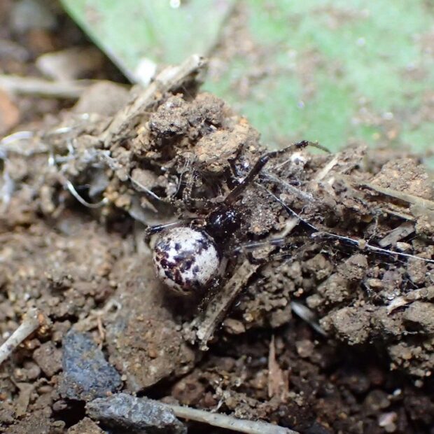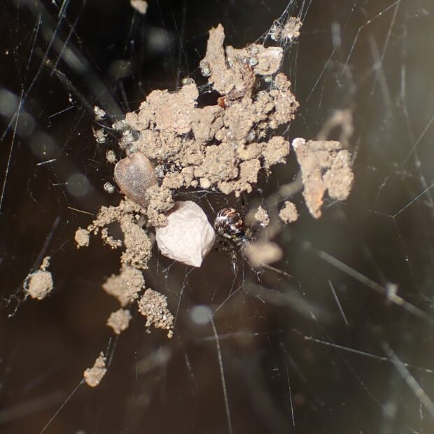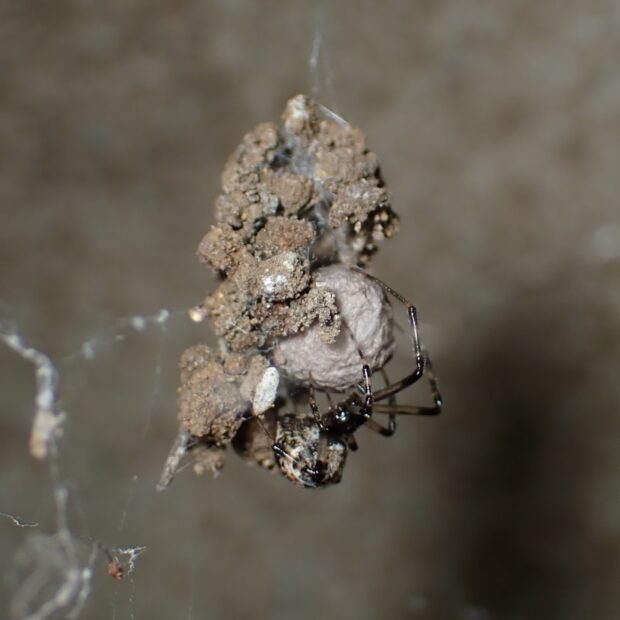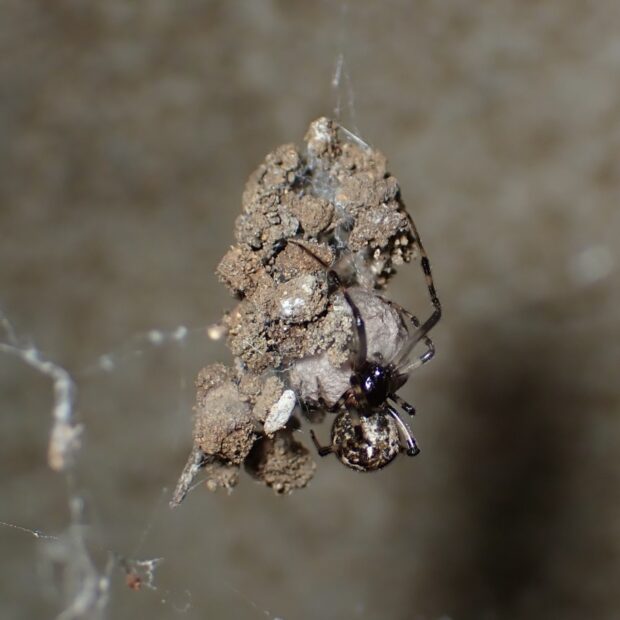 ヒメグモの仲間。 平地~山地まで広く生息し、 石垣やコンクリート壁などで見られます。 不規則網を張り、 土、 砂、 食べかすなどをつけたつりがね状の住居を作り、 その中に潜んでいます。 ツリガネヒメグモに似ていますが、 本種は大きいです。