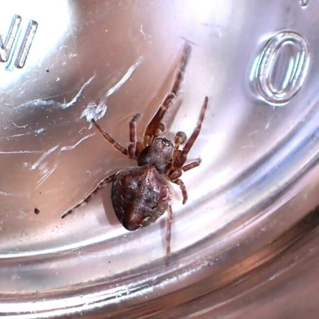 コガネグモ科の仲間。 お尻がややとがったあずき色の小さなオニグモ。 平地~山地まで広く生息し、 草はら、 樹林地など様々な環境で見られます。 垂直または斜めに円網を張り、 網の端の枝や葉裏に潜んでいます。 名前はクモ学者の緒方清人に因みます。 南方系のクモですが北上中。