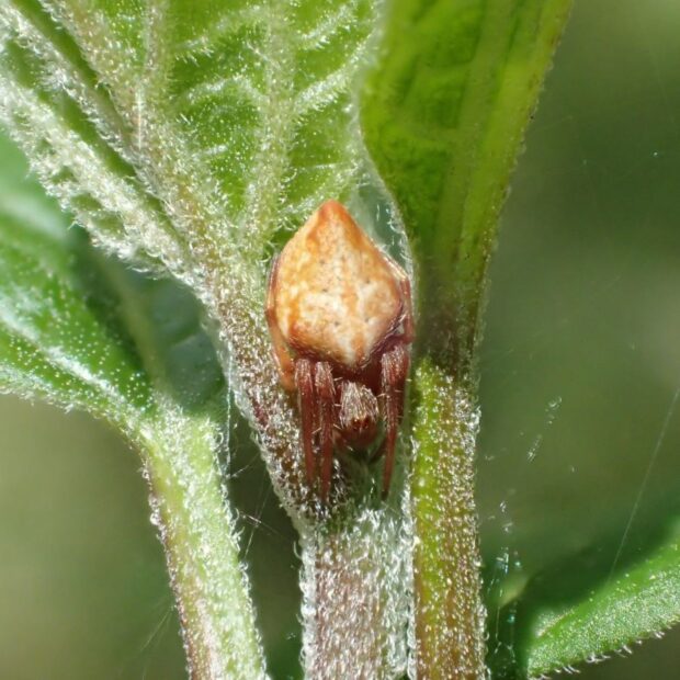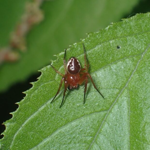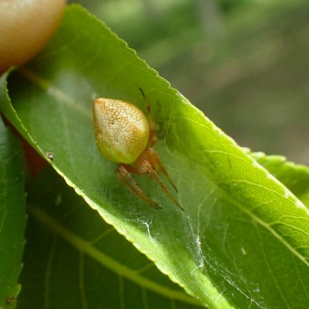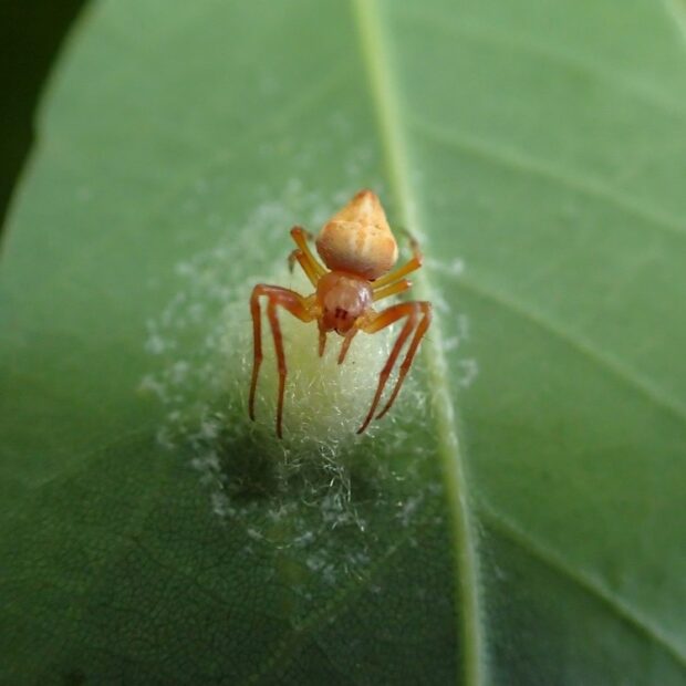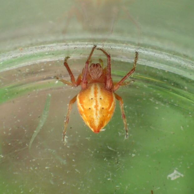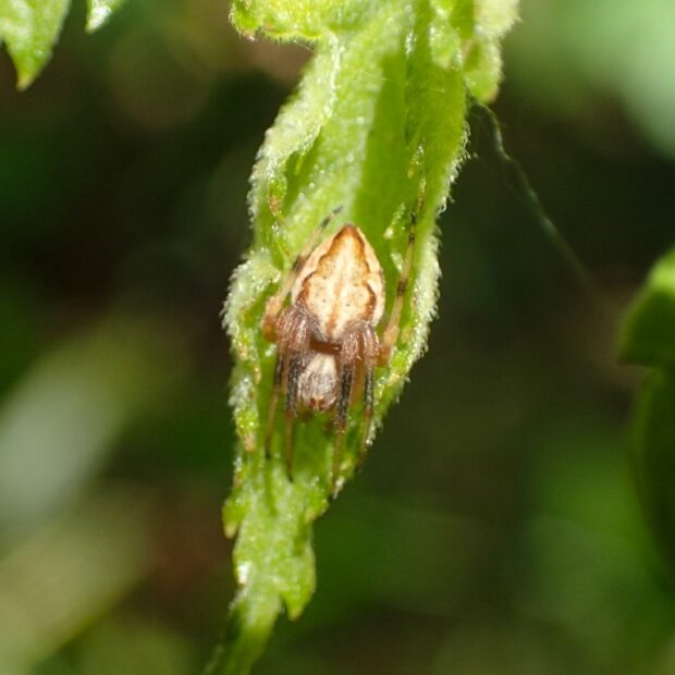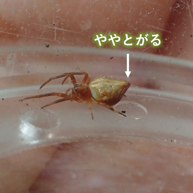 コガネグモの仲間。 小型のオニグモの一種で、 樹林地などに垂直または斜めに円網を張ります。 メスの腹部にはオレンジ色の模様がありますが、 色彩変異があり色はさまざまです。 メスは腹部の後端がややとがっています。