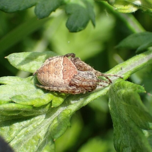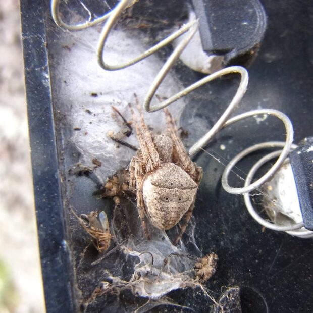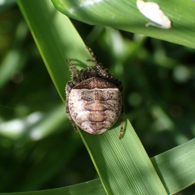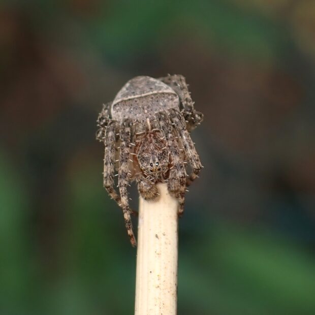 早春に成熟するコガネグモ科の仲間。 水田の周辺や草地などで見られます。 腹部の上方にある横線が目立ちますが、 はっきりしない個体もいます。 オニグモの仲間としては珍しく、 水平に円網を張ります。 キザハシとは階段を意味し、 腹部には段がついています。