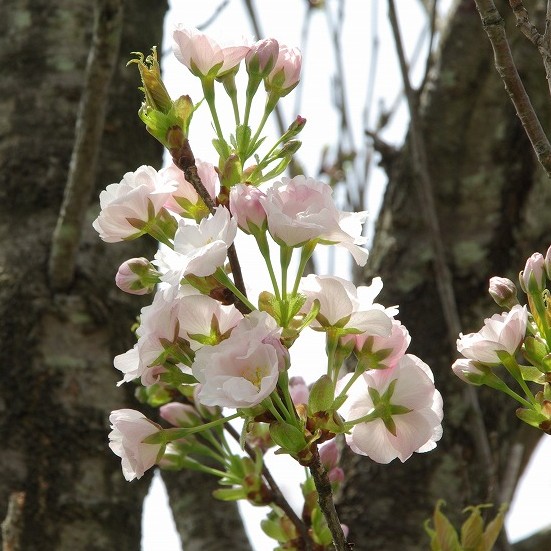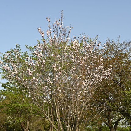 アマノガワは枝(えだ)がすべて上向き(うわむき)に伸びる(のびる)ため箒(ほうき)状(じょう)の樹(き)形(がた)になります。 これは野生(やせい)種(しゅ)のサクラには見(み)られない特徴(とくちょう)です。 A:シマトネリコ B:シダレザクラ