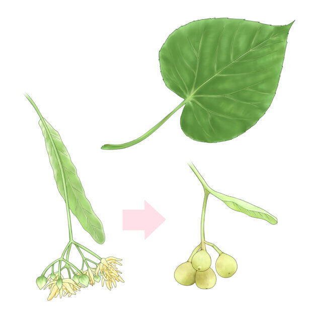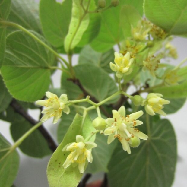 オオバボダイジュの花(はな)は1cmほどの淡い(あわい)黄色(きいろ)です。枝(えだ)の先(さき)に集まっ(あつまっ)て咲き(さき)、枝(えだ)が垂れ下がり(たれさがり)ます。