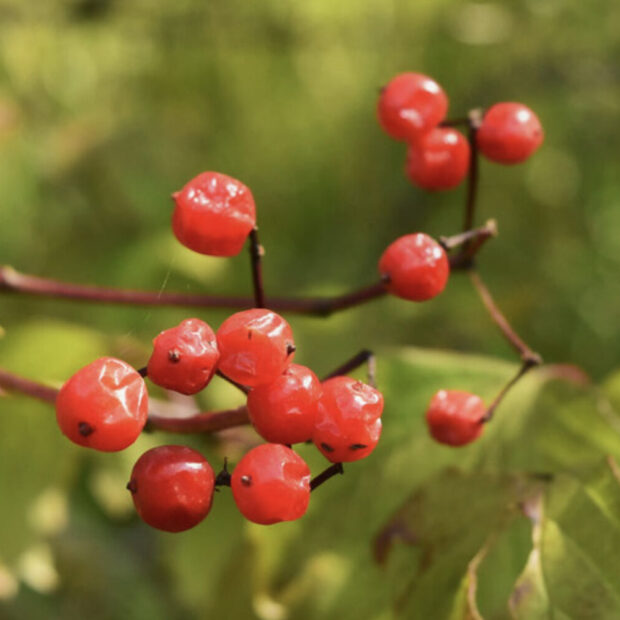 9月(つき)~10月頃(つきごろ)に、赤い(あかい)小さな(ちいさな)実(み)をたくさんつけます。実に(じつに)は苦味(にがみ)があるので鳥(とり)に食べ(たべ)られず、真冬(まふゆ)になっても残っ(のこっ)ていることが多い(おおい)です。