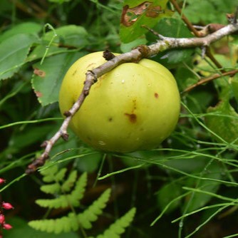 クサボケの実は(じつは)、香り(かおり)が良く(よく)美味し(おいし)そうですが、じつは渋く(しぶく)て酸っぱい(すっぱい)です。そのままでは食べ(たべ)られませんが、香り(かおり)が良い(よい)ので果実(かじつ)酒(しゅ)の材料(ざいりょう)にされます。