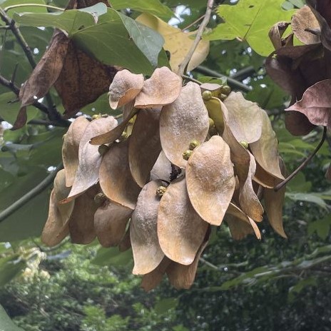(なつ)から(あき)にみのる実は(じつは)熟す(じゅくす)(まえ)裂け(さけ)て、スプーンがくっついたような(かたち)になります。これは(かぜ)がふくと回転(かいてん)しながら飛ん(とん)でいきます。
