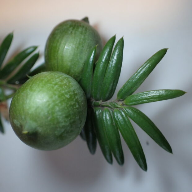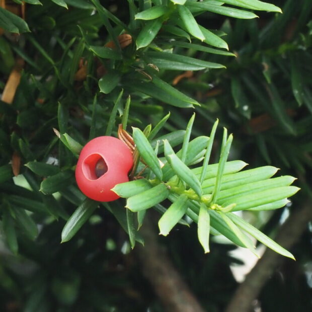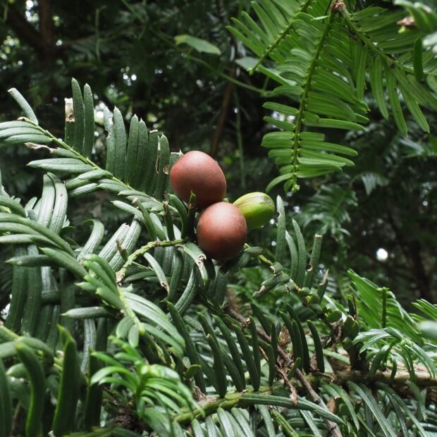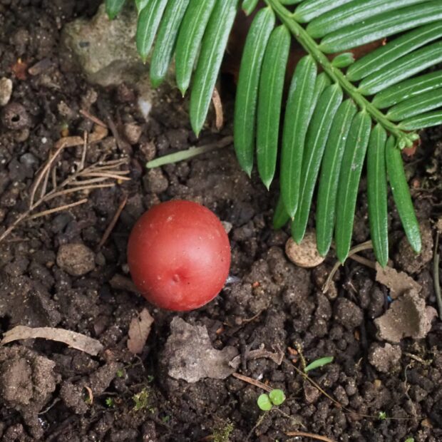 正解(せいかい)はAです。イヌガヤのタネの外側(そとがわ)のぶどうの果肉(かにく)みたいな部分(ぶぶん)はタネの皮(かわ)が厚く(あつく)なったものです。 Bの杯(はい)状(じょう)のタネはイチイです。尖っ(とがっ)た葉(は)先(さき)と一緒(いっしょ)に付い(つい)ているCはカヤです。