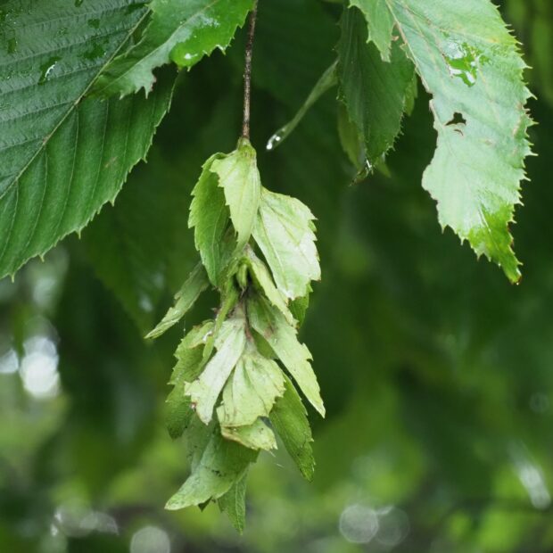 イヌシデの「シデ」は、実(み)の形(かたち)が神社(じんじゃ)のしめ縄(しめなわ)などについている四(よん)手(て)に似(に)ていることからつきました。普通(ふつう)シデと呼ば(よば)れるアカシデと似(に)ていて違う(ちがう)という意味(いみ)で「イヌ」とつきました。