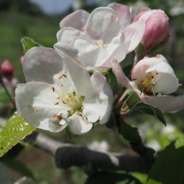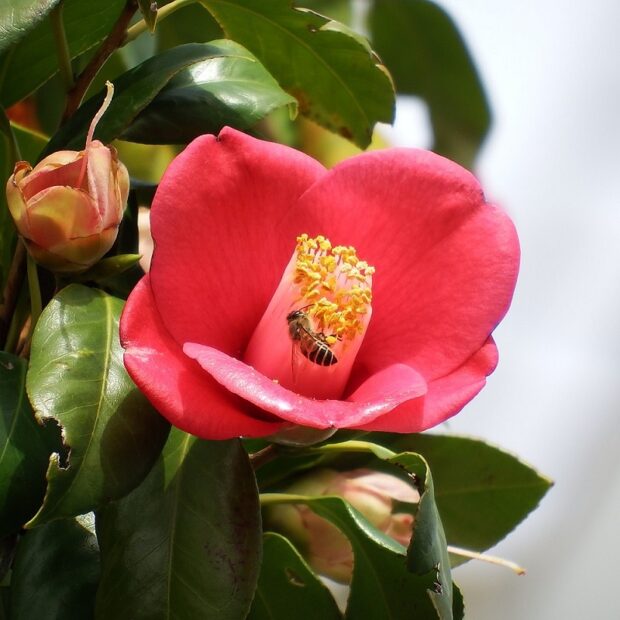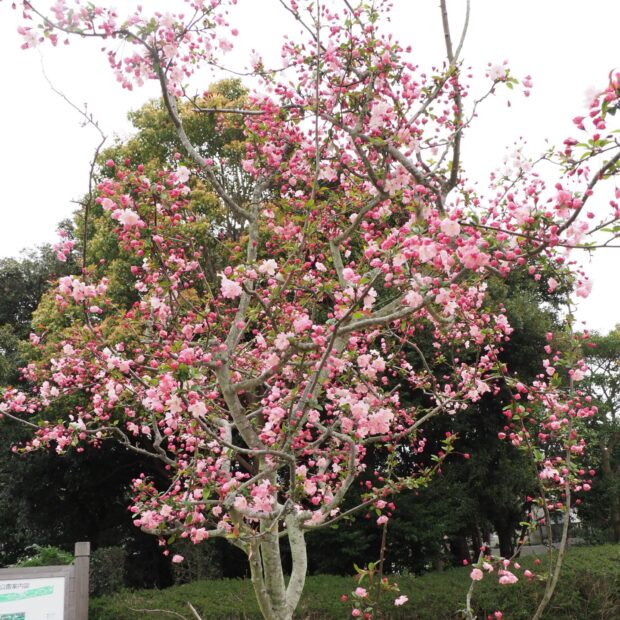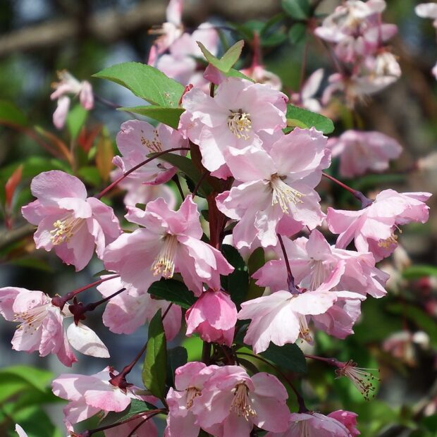 ハナカイドウはリンゴの仲間(なかま)で春(はる)、 淡い(あわい)ピンク色(ぴんくいろ)の花(はな)が垂れ下がっ(たれさがっ)て咲き(さき)ます。 中国(ちゅうごく)で「海棠(かいどう)(かいどう)」は美人(びじん)の代名詞(だいめいし)でした。 B:ヤクシマツバキ(別名(べつめい)リンゴツバキ) C:リンゴ