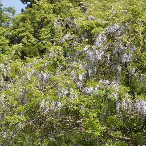 フジは木(き)の幹(みき)に巻き付い(まきつい)て、木(き)の上(うえ)の光(ひかり)の当たる(あたる)ところまで伸び(のび)ていきます。巻き付い(まきつい)た木(き)が細い(ほそい)と、ときにはその木(き)を絞め殺し(しめころし)てしまうこともあります。