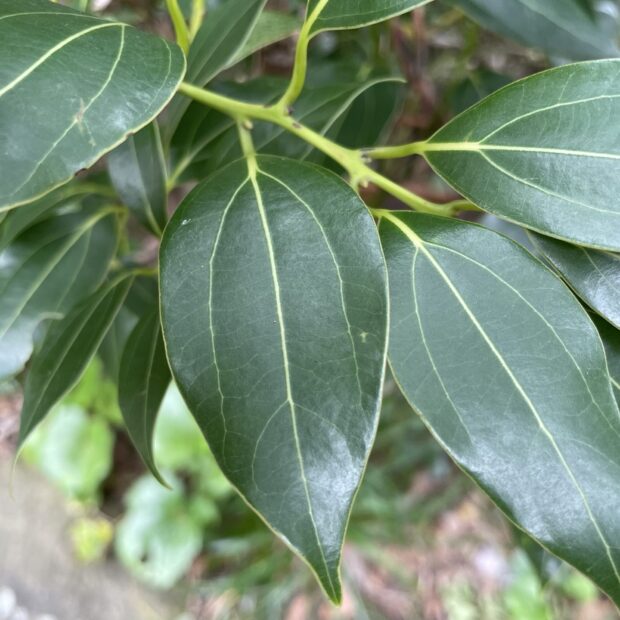 ヤブニッケイの葉っぱ(はっぱ)は、シナモンとも呼ば(よば)れ香辛料(こうしんりょう)として使わ(つかわ)れるニッケイに似(に)た香り(かおり)がします。樹皮(じゅひ)もニッケイの香り(かおり)がして薬用(やくよう)に用い(もちい)られます。