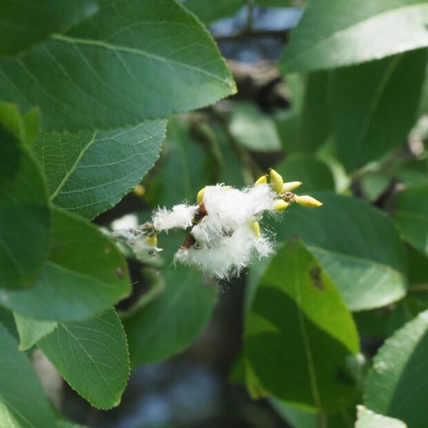 マルバヤナギの種(たね)はふわふわの綿毛(わたげ)のついた種(しゅ)です。風(かぜ)にのってふわふわと空中(くうちゅう)をとんでいきます。 ヤナギの仲間(なかま)の種(たね)は全て(すべて)同じ(おなじ)ような種(しゅ)です。
