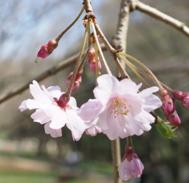シダレザクラは、サクラの野生(やせい)種(しゅ)「エドヒガン」の園芸(えんげい)品種(ひんしゅ)になります。花(はな)の後ろ(うしろ)がぷっくり膨らむ(ふくらむ)のがエドヒガンの特徴(とくちょう)です。