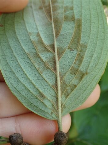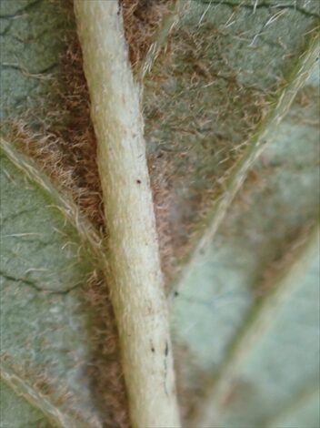 虫めがね(むしめがね)で葉(は)裏(うら)を見る(みる)と、茶色い(ちゃいろい)毛(け)がはえているのがわかります。葉っぱ(はっぱ)を見(み)て「虫(むし)がいる!」とおびえる人(ひと)もいるのですが、葉脈(ようみゃく)の付け根(つけね)に毛(け)が生え(はえ)ているだけです。この毛(け)がなんの役割(やくわり)をしているのかはよくわかりません。